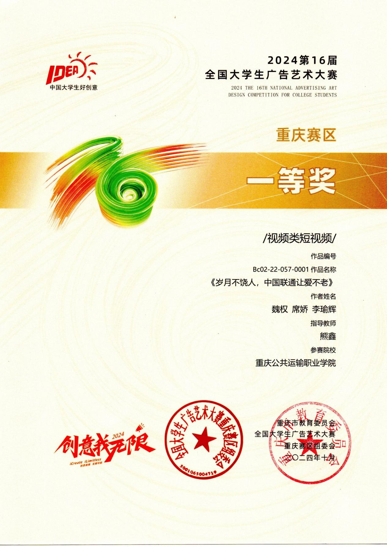 其中,获得比赛一等奖的作品,是由公共管理学院魏权、席娇、李瑜辉3名同学创作的《岁月不饶人,中国联通让爱不老》微视频,指导老师由熊鑫担任。作品围绕中国联通“让爱不老”的主题,采用温情叙事手法,通过跨代互动展现爱的传承与不朽。画面温馨怀旧与现代交融,配以感人旋律,传递中国联通连接人心、让爱跨越时空的品牌温度。