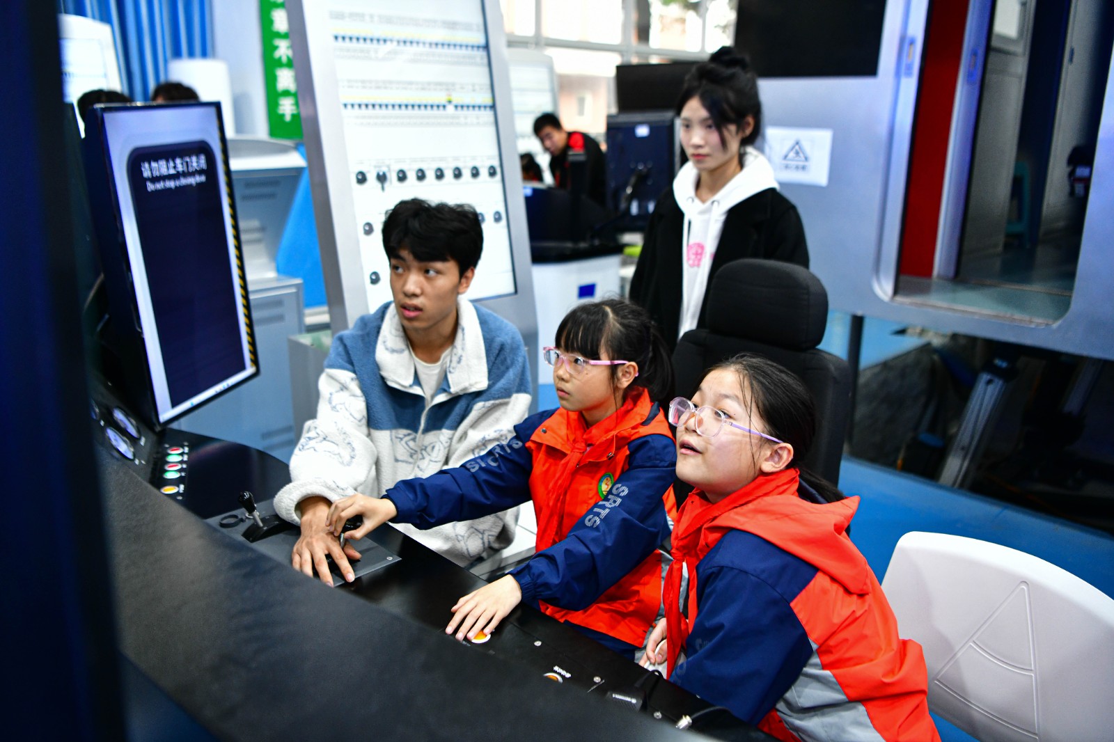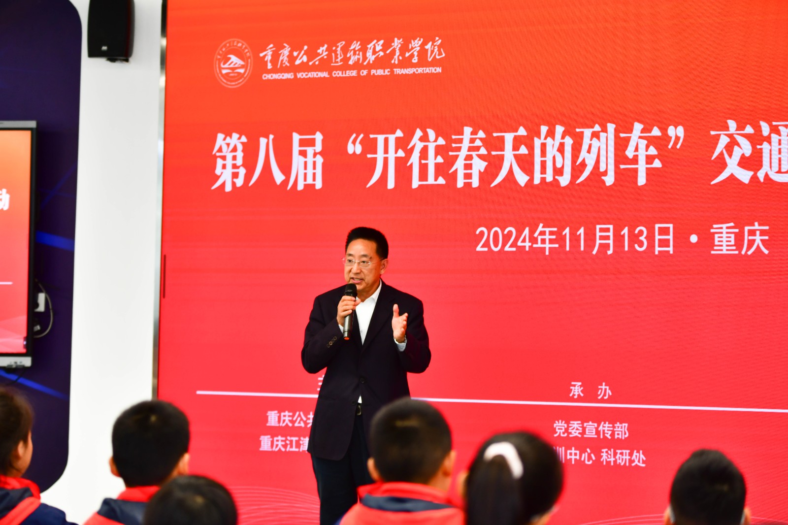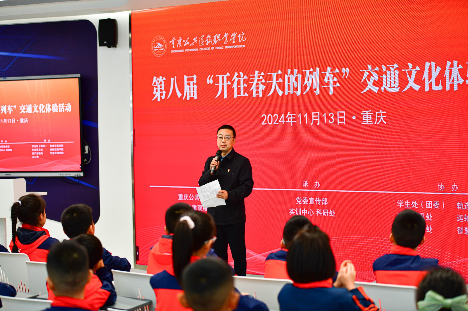 在学校虚拟仿真实训基地举行的活动启动仪式上,重庆运输职院党委书记白凯在致辞中,对前来参加活动的双福第二小学的老师、家长代表和50多名小朋友表示欢迎,并简要介绍学校鲜明的国企办学、轨道交通特色和办学成果。