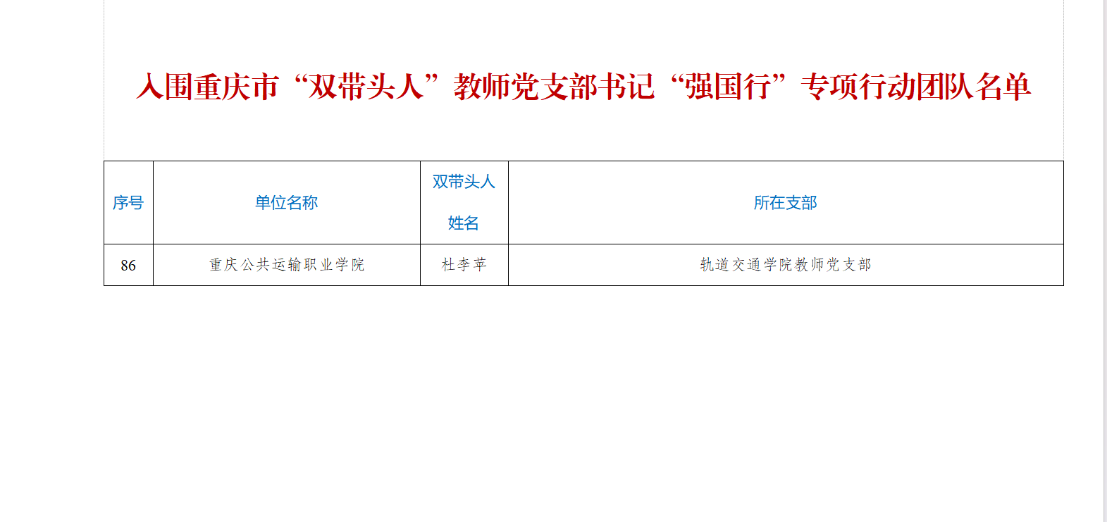 重庆市委教育工委近日发出通知,公布入围重庆市高校“双带头人”教师党支部书记“强国行”专项行动团队名单,电子游戏轨道交通学院教师党支部榜上有名,成功入选,学校对标一流、改革攻坚,在基层党建等方面取得新进展。