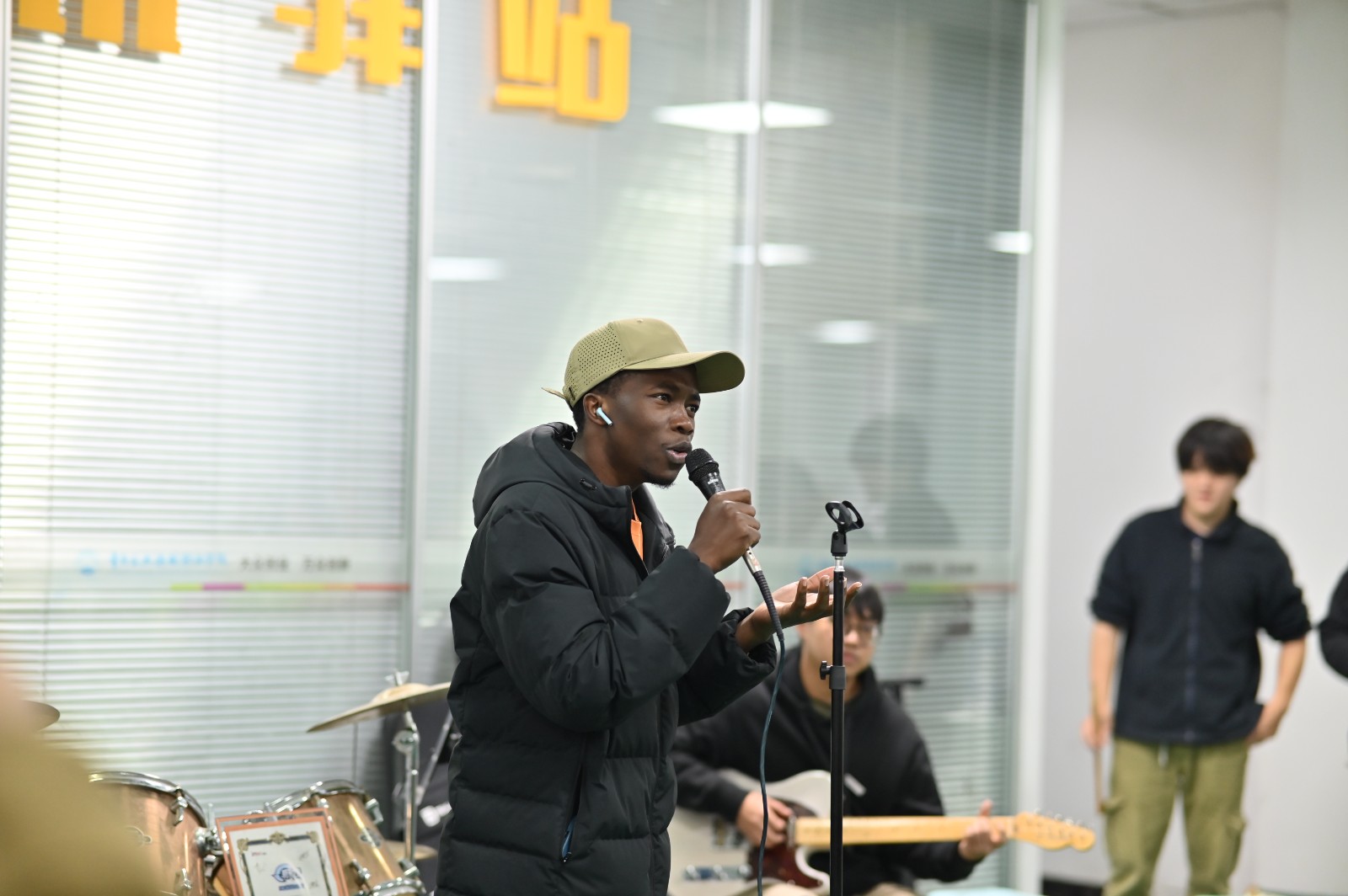 一曲结束,来自卢旺达的约书亚同学主动要求现场和乐队成员一起用乐队伴奏唱首歌,来自老挝的程伟同学主动担任吉他手,架子鼓、钢琴、贝斯等则由电子游戏当时在活动中心练习的同学担任。