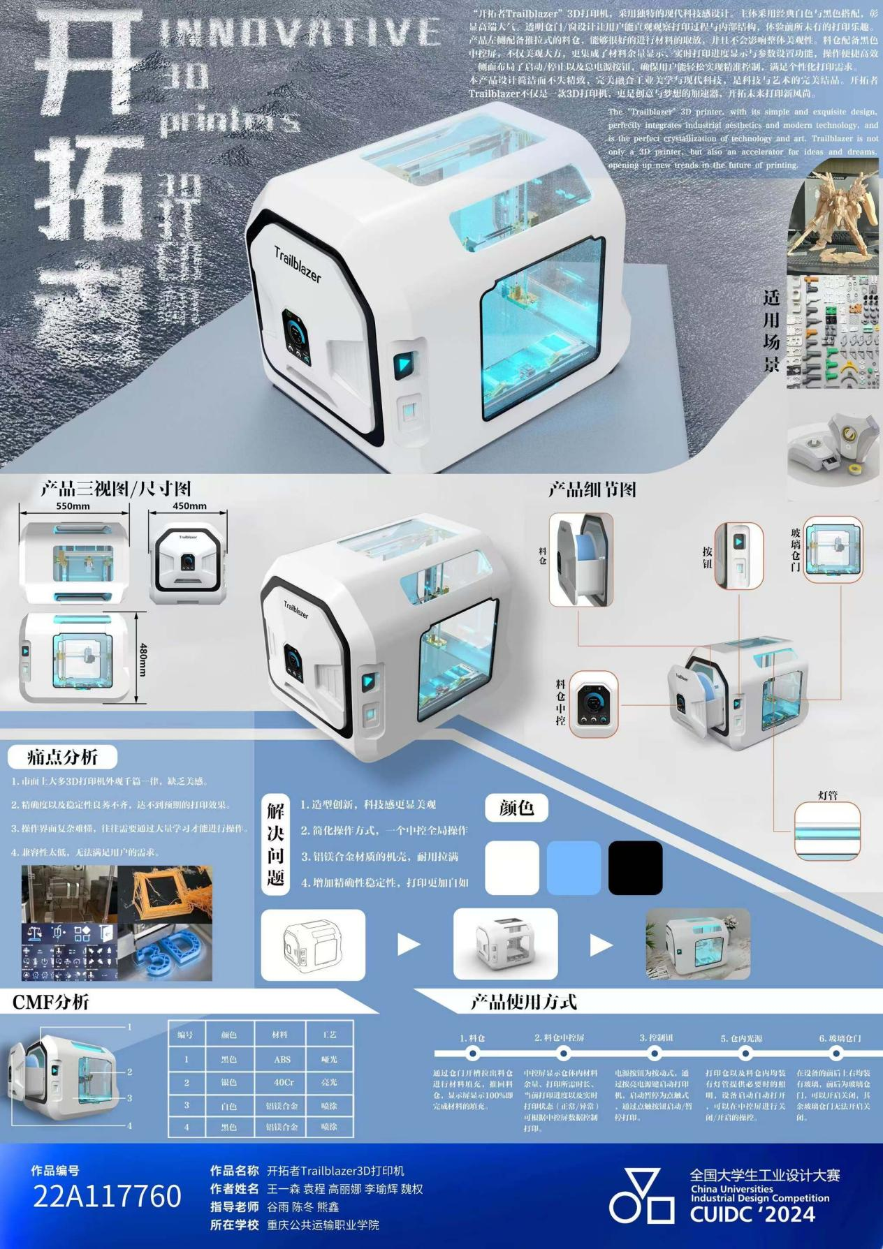 获得比赛一等奖的,是由来自公共管理学院王一森、袁程、高丽娜、李瑜辉、魏权同学设计的作品《开拓Trailblazer3D打印机》,指导老师由谷雨、陈冬、熊鑫担任。该作品是一款融合工业美学与现代科技的3D打印设备,针对原有产品耗材存储仓存在易受潮的问题,通过设备内置料仓,将耗材余量、参数设置等集中于中控,确保用户实现精准控制。