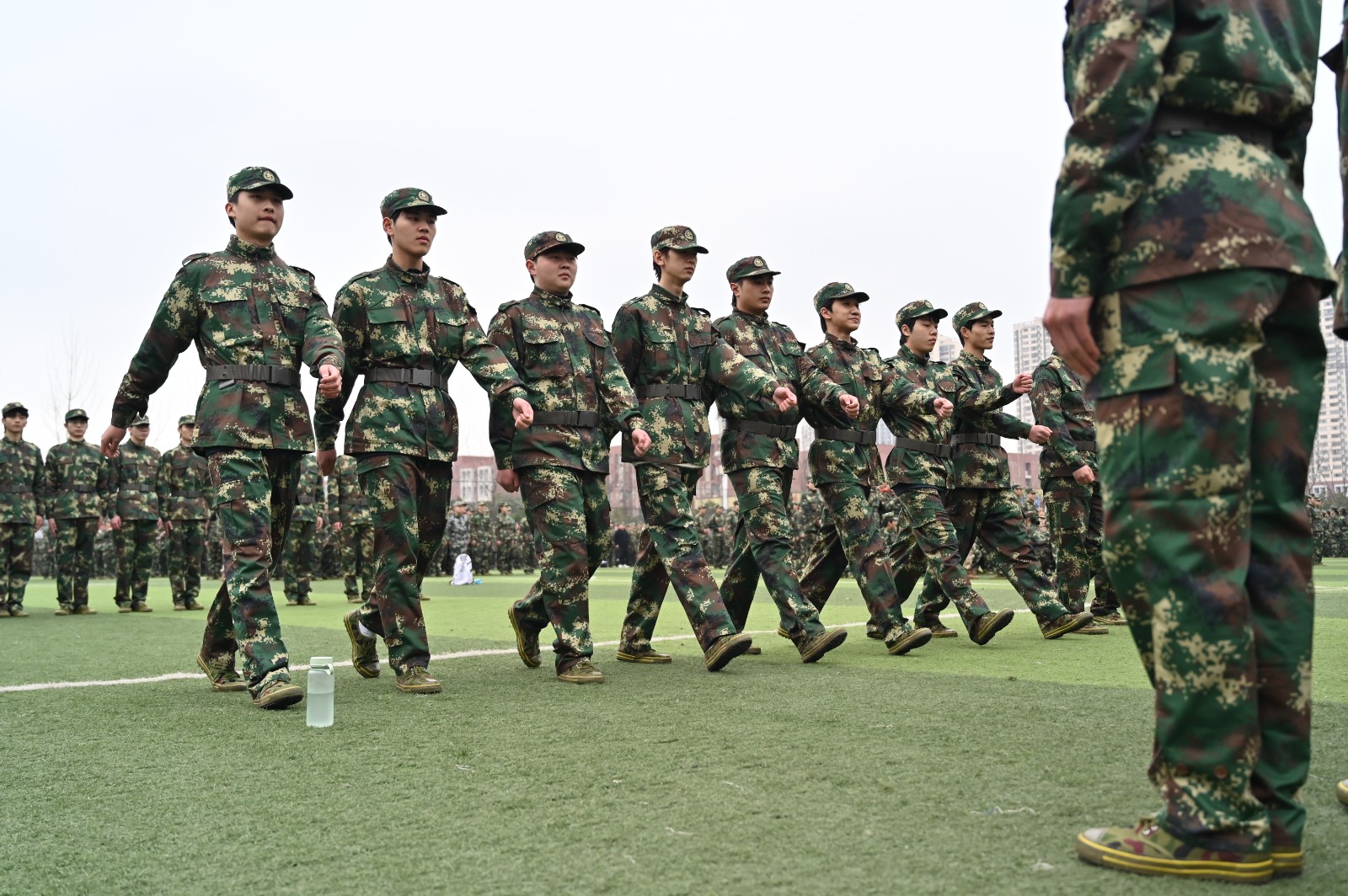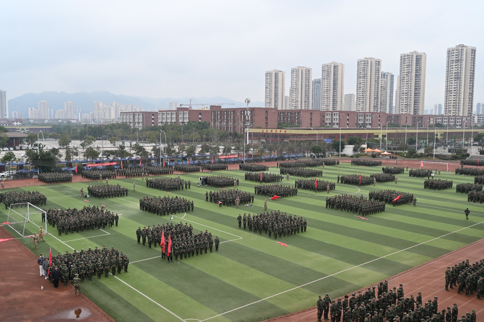 当天早上7点,3600多名2024级新生被编入4个营、52个连,在新校区体育场等处同时开训。
