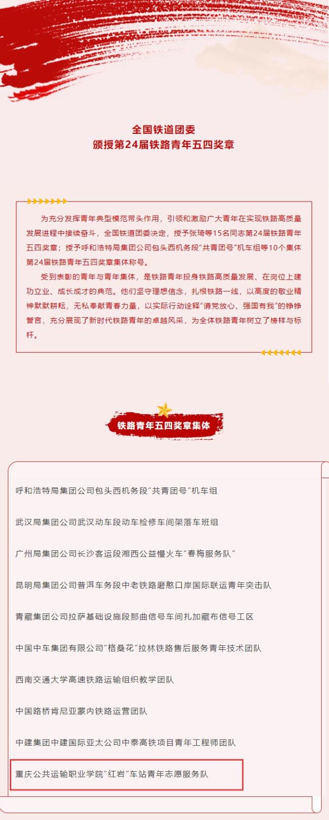 近日,全国铁道团委发出专门通知,公布第24届铁路青年五四奖章表彰名单,电子游戏“红岩”车站青年志愿服务队榜上有名,获评铁路青年五四奖章集体,成为本次表彰中