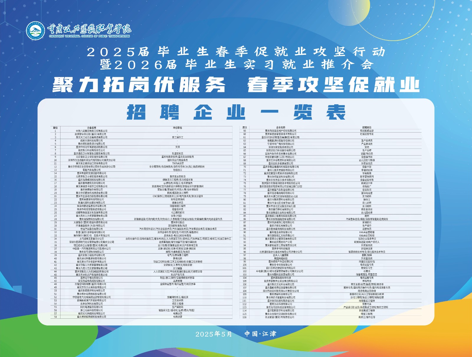 本次双选会结合学校的专业特色及学生需求,邀请来自重庆、四川、浙江、广东、安徽等多个省市,包括中铁八局集团电务工程有限公司、中铁建电气化局集团运营管理有限公司、重庆京东方光电科技有限公司等知名企业在内的120多家家优质企业,携带6000多个优质岗位到校招聘,专业领域涵盖公共交通、智能制造、建筑工程、新能源、学前教育等。
