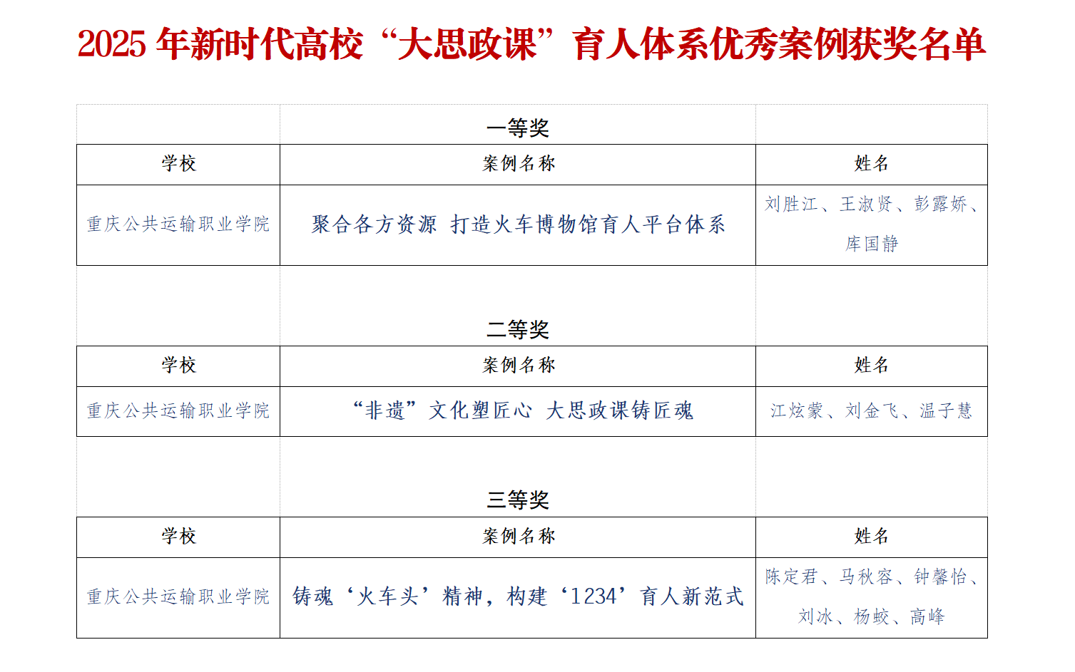其中,获得评选活动一等奖的,是由学校党委宣传部刘胜江牵头申报的、题为“聚合各方资源、打造火车博物馆育人平台体系”的案例;获得评选活动二等奖的,是由学校学生处江炫蒙牵头申报、题为“非遗文化塑匠心、大思政课铸匠魂”的案例;获得评选活动三等奖的,是由学校轨道交通学院陈定君牵头申报、题为“铸魂‘火车头’精神,构建‘1234’育人新范式”的案例。
