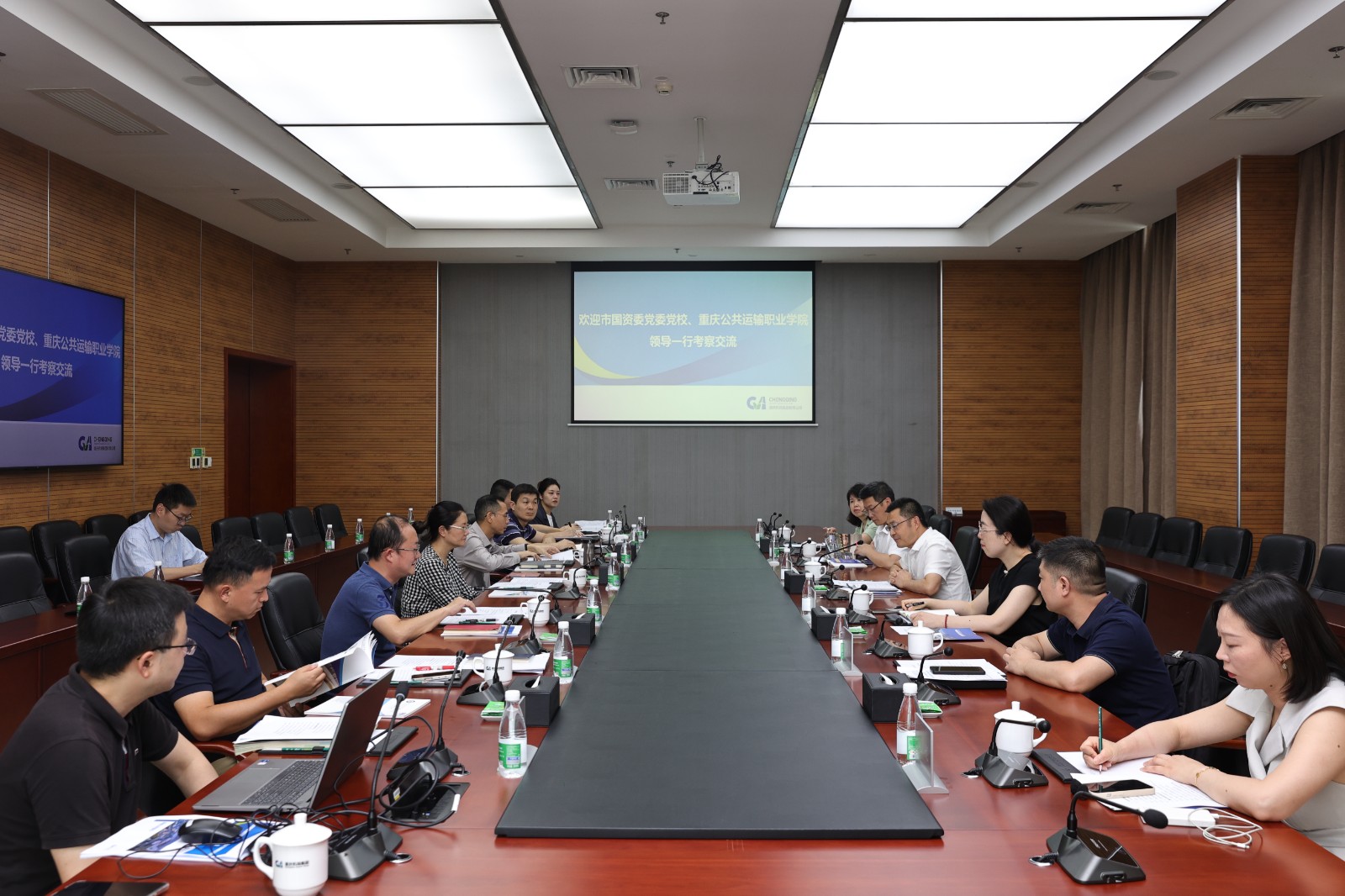 在重庆机场集团相关会议室举行的校企座谈会上,双方与会人员围绕市国资委党委党校建设、校企合作、产教融合、资源共享等议题,进行深入沟通交流。