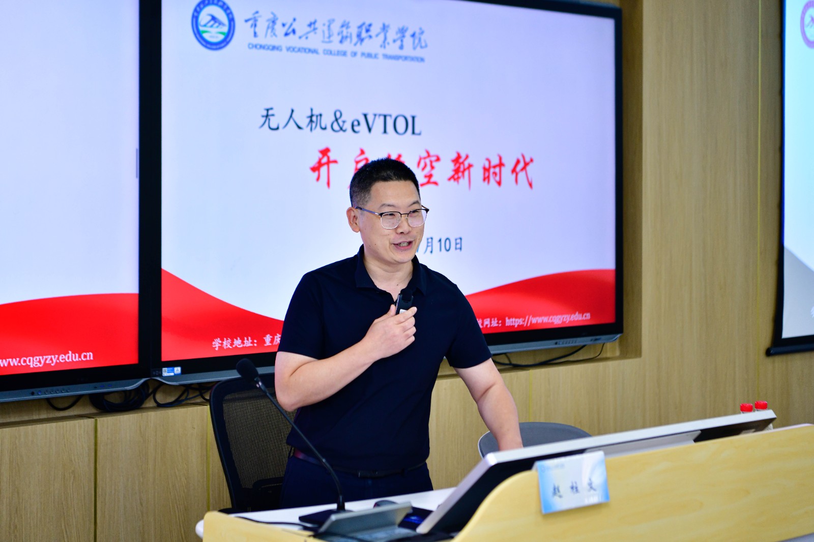 在研讨交流环节,运输贸易学院赵柱文以“低空经济eVTOL,开启低空新时代”为题,从低空经济是什么、缘何低空经济“热”、低空经济市场规模预期、重庆低空经济现状分析及发展趋势、电子游戏发展低空经济专业群的建议等方面,分享自己的研究和思考。