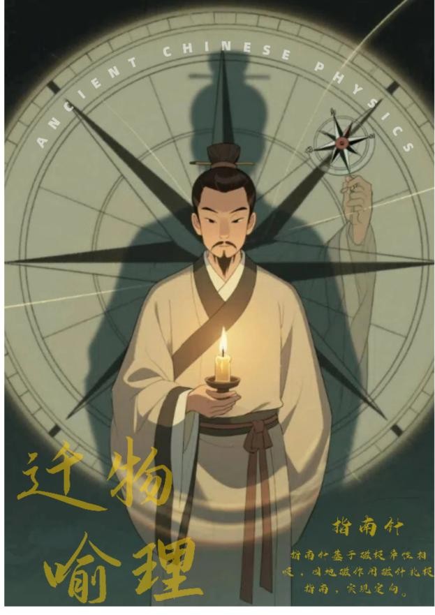 该作品以古代中国科学家为主题,展示了古代中国物理学的两个重要成就。第一幅描绘了小孔成像的原理,通过蜡烛的光线穿过小孔在屏幕上形成倒立的物像,体现了光的直线传播特性。第二幅则展示了指南针的发明,指南针利用地球磁场指示方向,是古代中国四大发明之一。两幅海报均以古代学者形象为载体,结合现代插画风格,生动诠释了迁物喻理的科学思想。