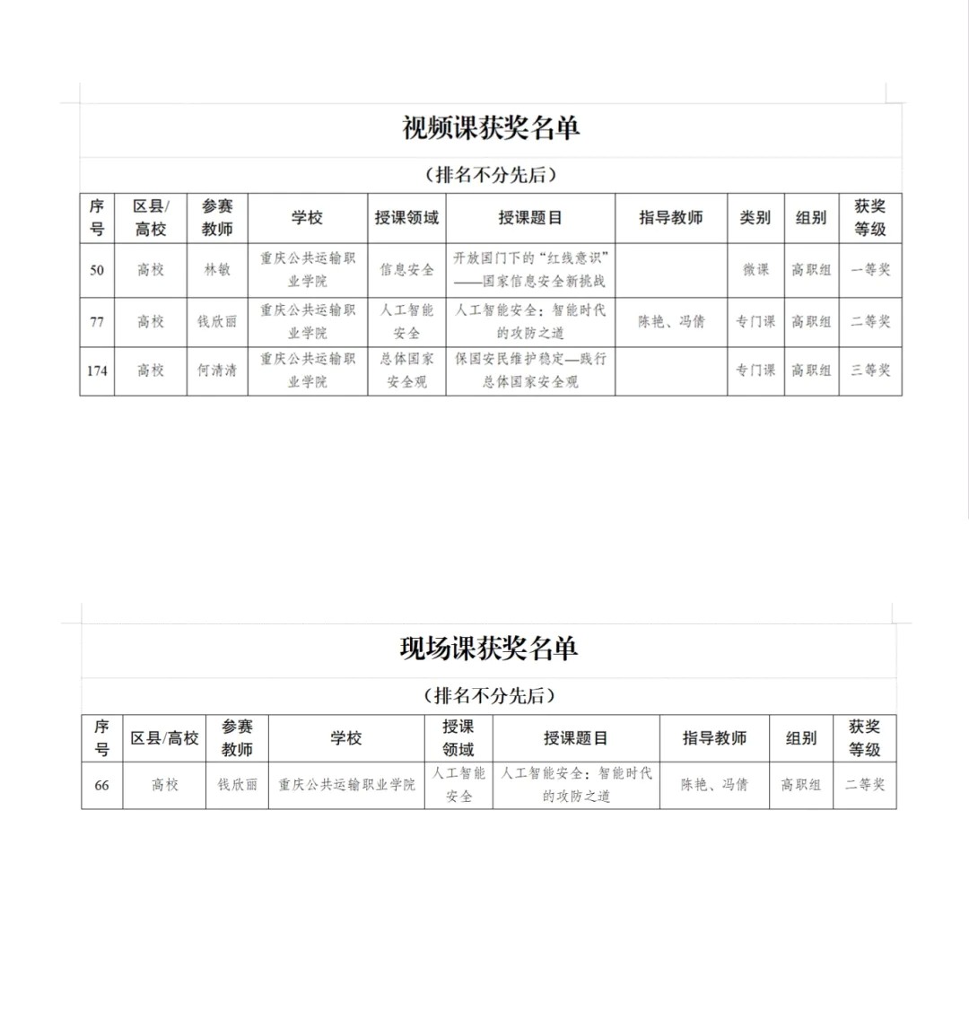 重庆市教育委员会近日发出专门通知,公布2025年全市大中小学国家安全教育优质课大赛获奖名单,电子游戏榜上有名,喜获高职组视频课微课类一等奖1项,视频课专门课类二等奖1项、三等奖1项,现场授课二等奖1项,展示学校对标一流改革、锚定“双高”攻坚,在国家安全教育方面不俗实力。