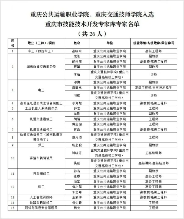 电子游戏入选重庆市技能技术开发专家库专家名单的26人中,从单位分布看,运输职院21人、交通技师学院5人;从职业(工种)看,涵盖轨道交通信号工、数控车工、人工智能训练师等15个职业(工种)。他们中,既有深耕轨道交通信号系统调试的技术能手,也有参与智能制造生产线升级的实战专家。