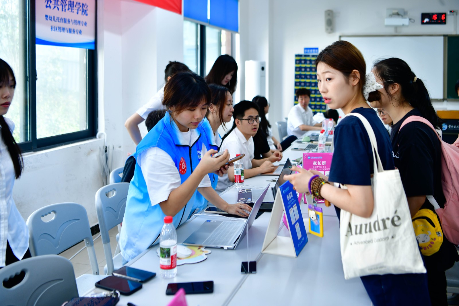 线上,依托新建“数字迎新系统”,新同学可以将选择寝室、缴纳学费和住宿费等事宜,在家提前一键搞定。线下,在新校区教学楼一楼各教室、会议室,设置报到大厅,厅内设有迎新综合咨询点、缴费点、家长休息室、入学绿色通道点、二级学院迎新接待点,可一站办理入学手续。校领导提出的线上捷办、线下快办的目标顺利达成。