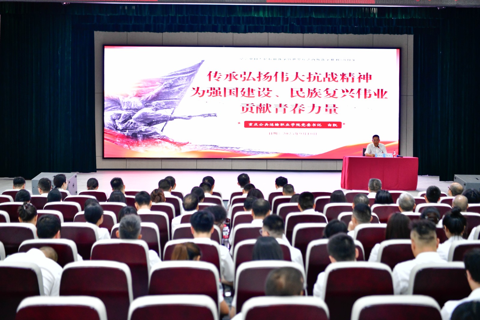 9月10日下午,在学校庆祝第41个教师节表彰大会结束后,学校党委书记白凯面向全体参加会议的师生,讲授抗战主题思政大课,引导全校师生传承和弘扬伟大抗战精神,为强国建设、民族复兴伟业贡献青春力量。