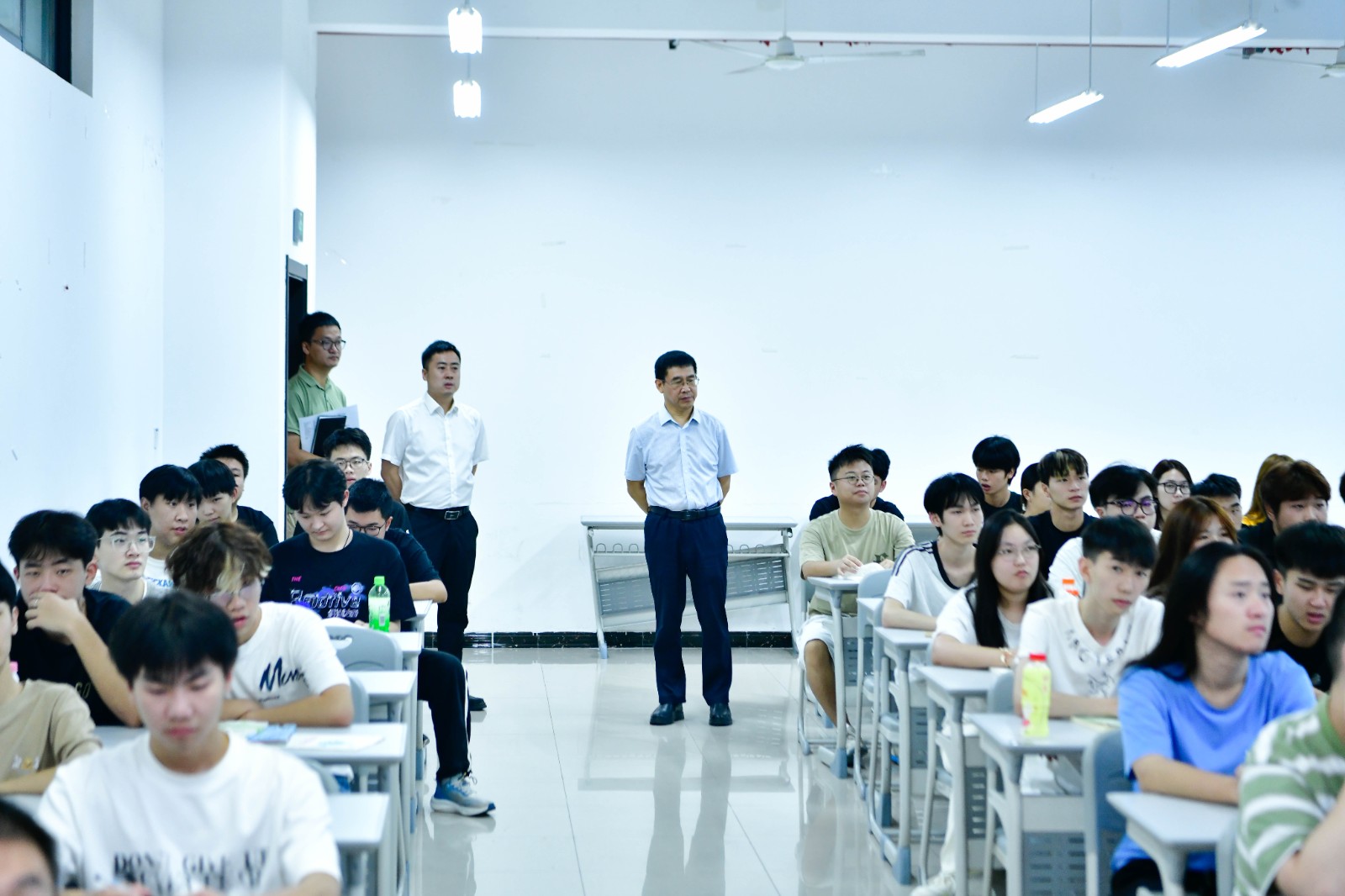 检查过程中,白凯、吴海峰等先后来到新校区相关教室、实训室,深入了解各二级学院2025级新生课堂教学组织、教师课堂讲授、学生课堂纪律、设施设备运行等情况,要求各单位树牢人才培养中心意识,在进一步加强教学准备、教学管理和教风、学风建设上下功夫,努力提升育人质量。