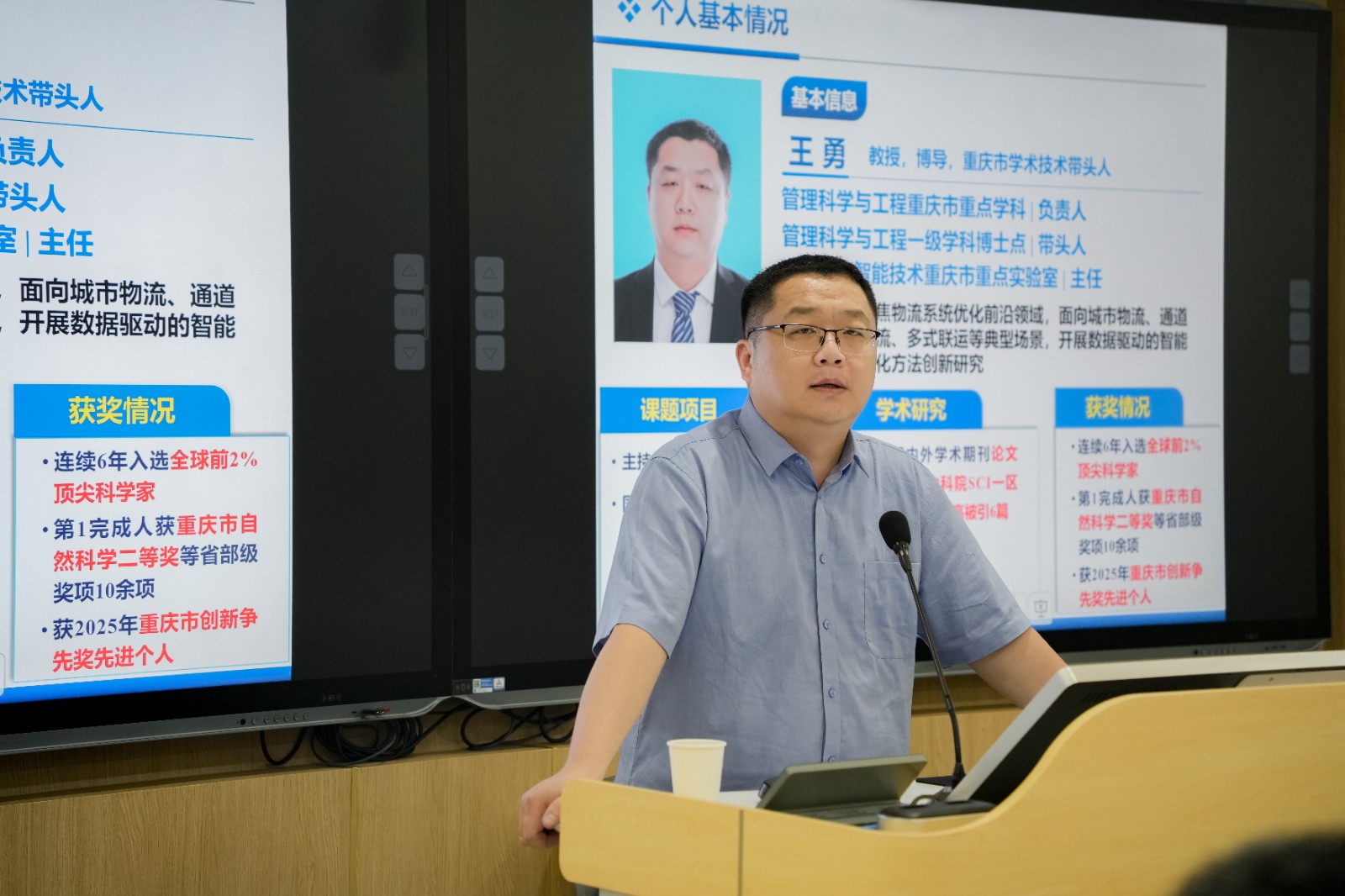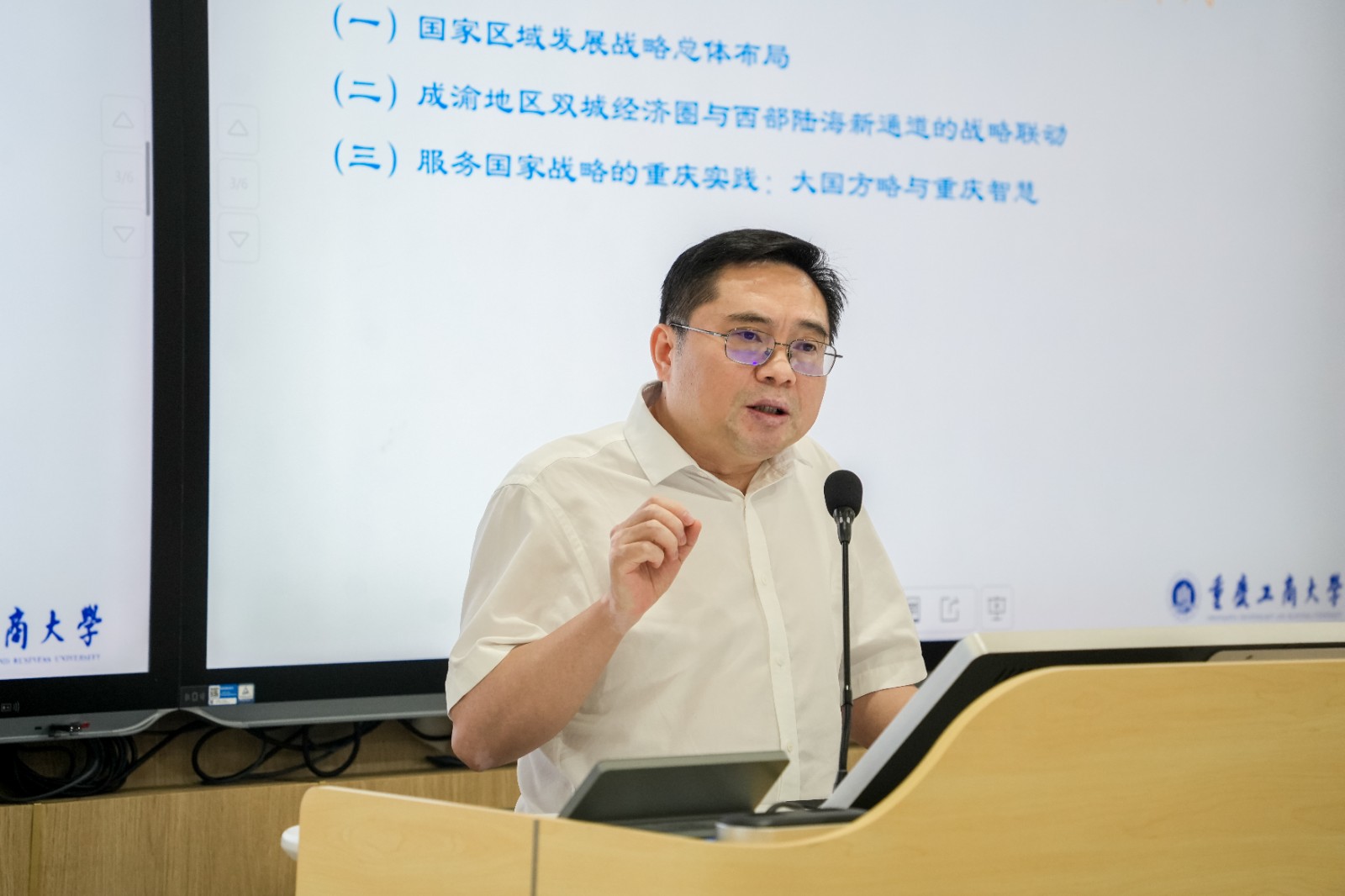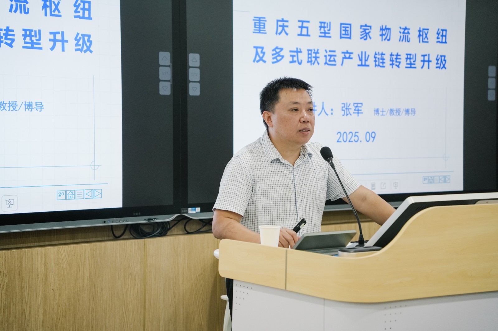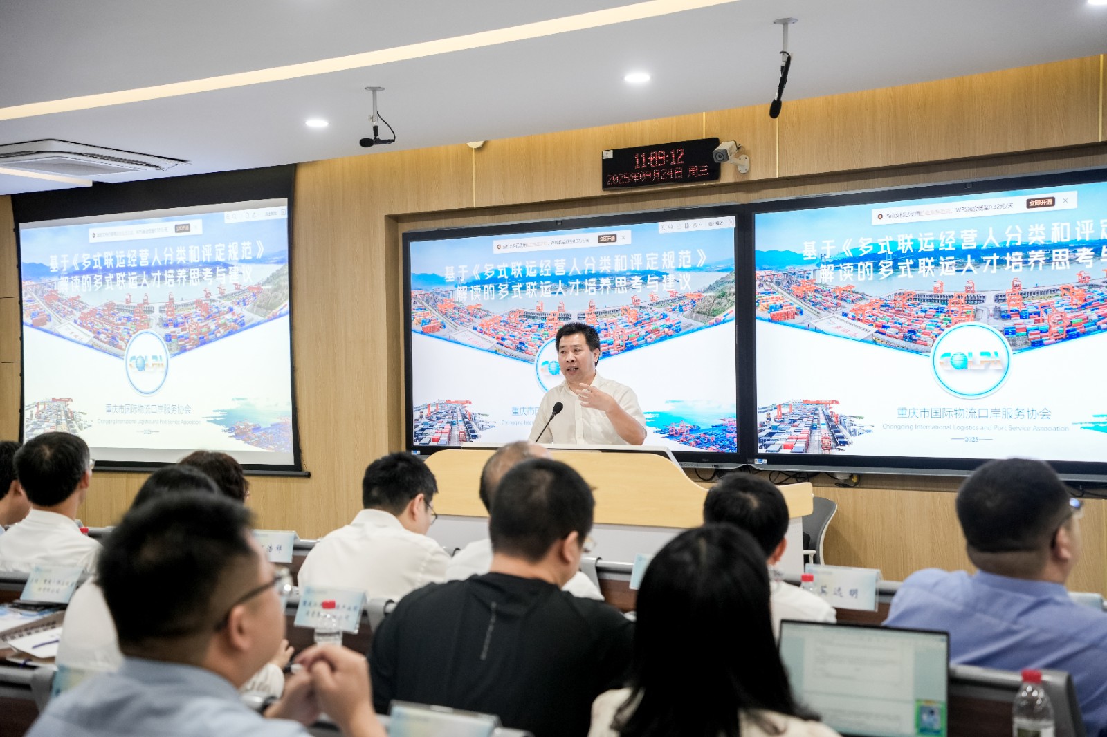 在主题报告环节,重庆工商大学莫远明教授以《“十五五”时期西部陆海新通道建设的走向研判及重庆作为》为题,从宏观政策层面剖析通道发展趋势;重庆交通大学王勇教授分享城市物流运输网络的资源配置与数智化调度方面的研究与思考;重庆工商大学张军教授分享重庆五型国家物流枢纽及其多式联运体系产业链转型升级相关内容;重庆市国际物流口岸服务协会秘书长蒋啸冰,以《多式联运经营人分类和评定规范》为题进行分享。