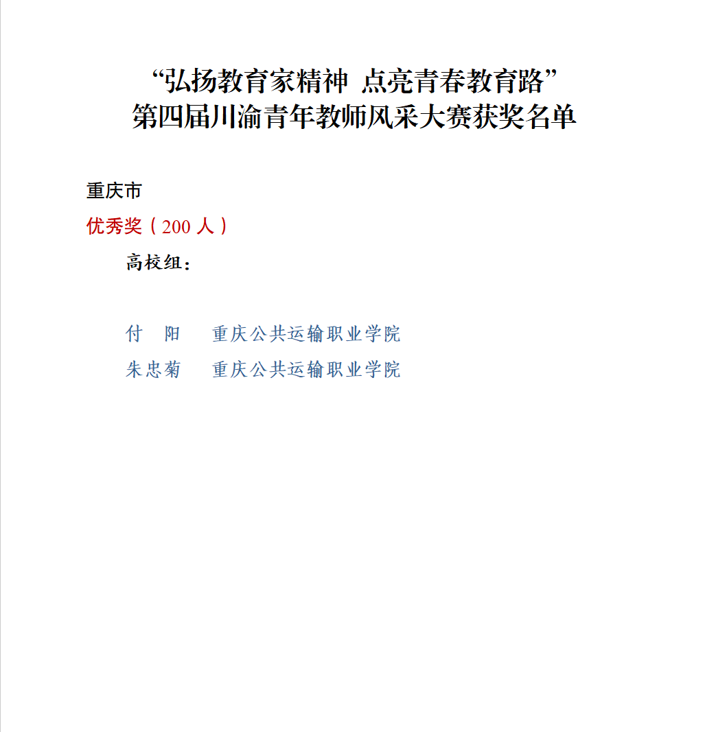 重庆市教育委员会、四川省教育厅近日公布第四届川渝青年教师风采大赛获奖名单,代表电子游戏参赛的付阳、朱忠菊两位老师榜上有名,获高校组优秀奖。