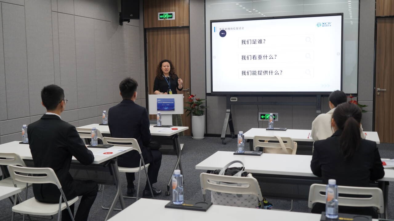 在企业宣讲环节,企业代表、集团人事部经理周桢在企业会议室,面向前往应聘的同学,介绍企业发展历程、主营业务、企业文化等情况。