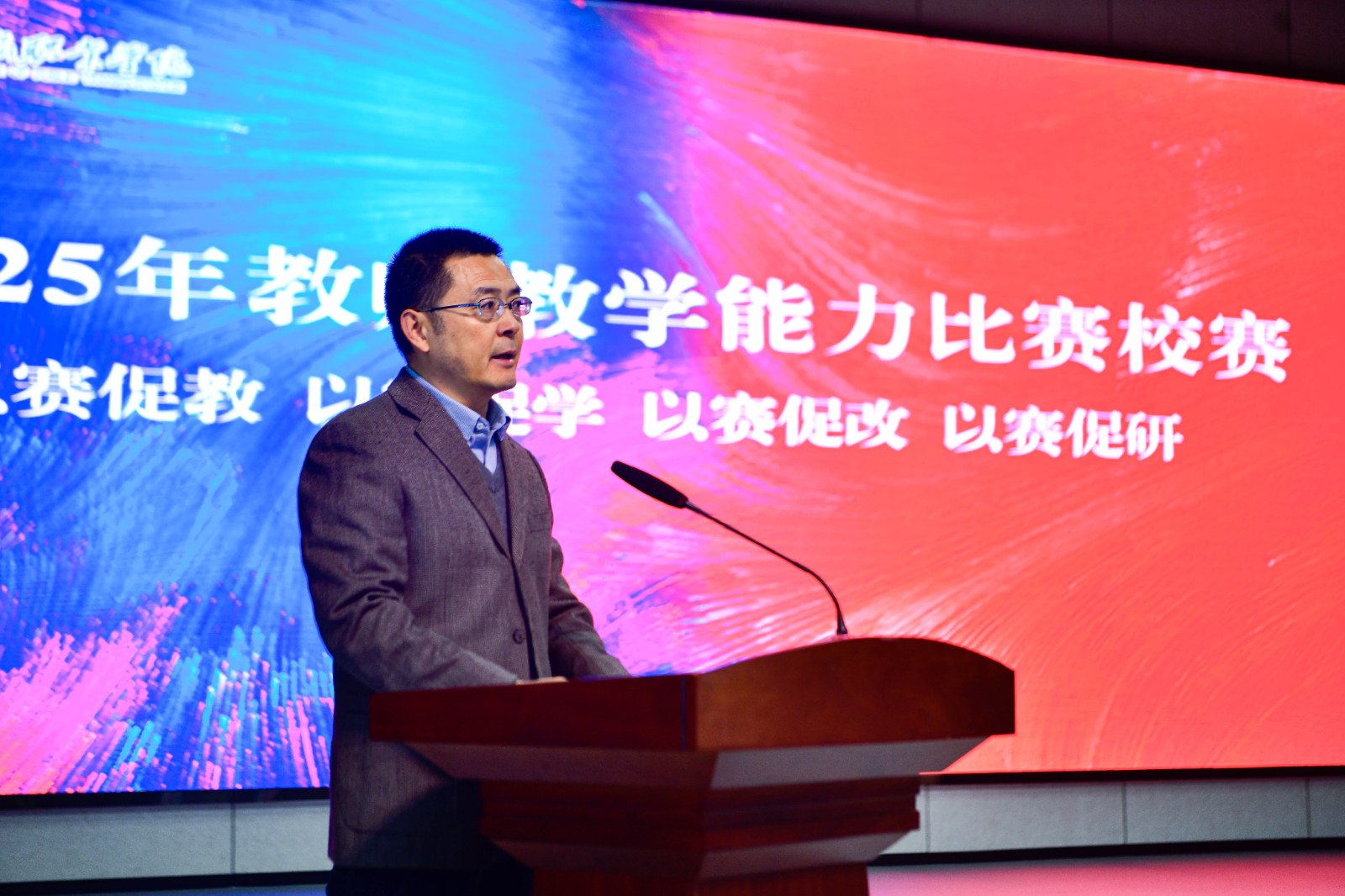 吴海峰校长在致辞中强调,教学能力比赛是促进教师专业成长的重要途径、是提升课堂教学质量的重要抓手,也是促进教学改革创新的重要平台。学校将以本次比赛为契机,继续强化“以赛促教、以赛促学、以赛促改、以赛促研”机制,推动教师队伍教学理念、方法和能力的全面提升,全面提升育人工作质效。