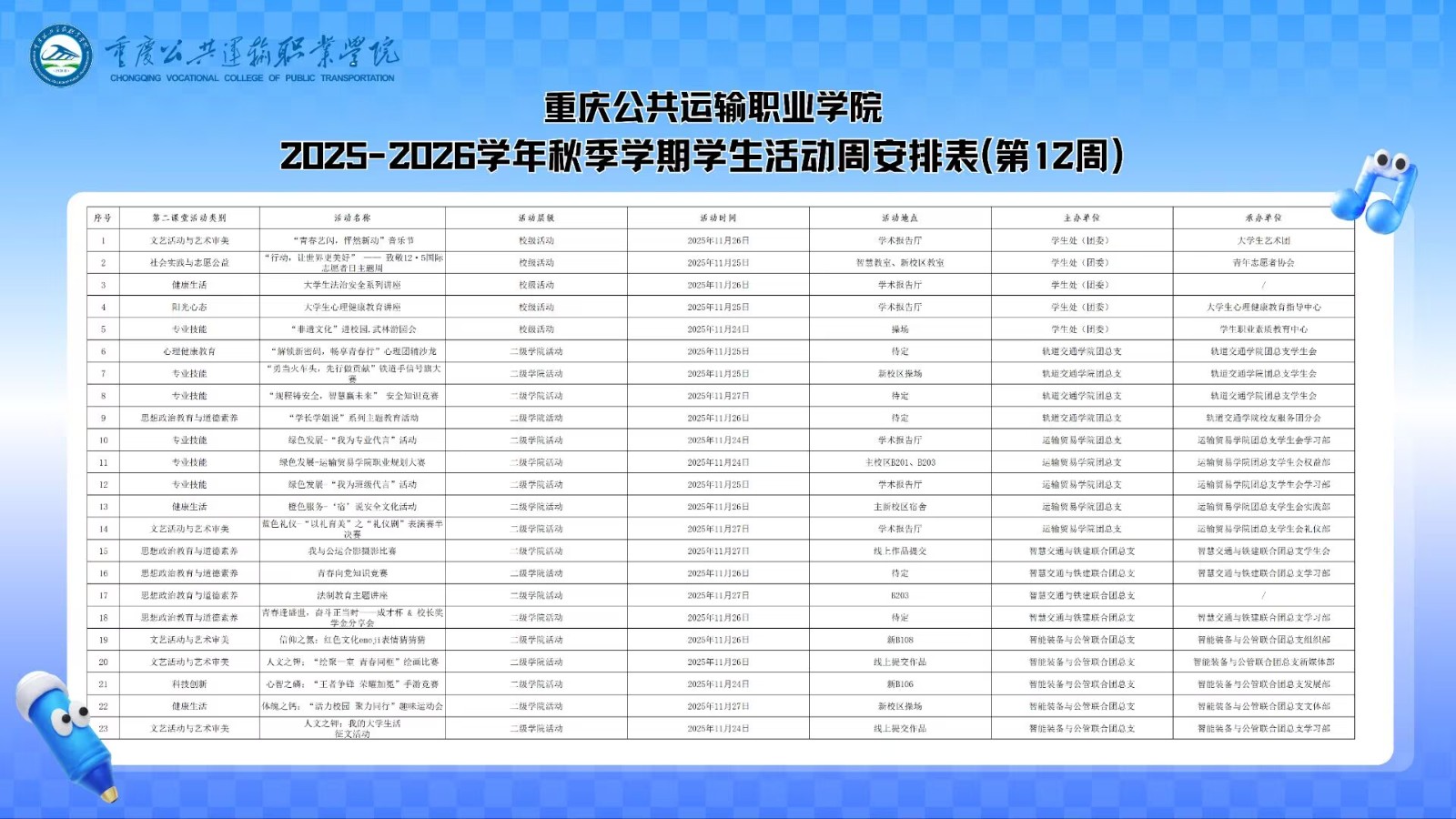 据了解,活动分校、院两级进行。内容涵盖文艺审美、专业技能、思政教育、健康生活四大板块。