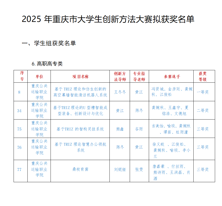 2025年重庆市大学生创新方法大赛决赛成绩近日揭晓,电子游戏榜上有名,获高职高专类一等奖1项、二等奖1项、三等奖3项,学校对标一流改革、锚定“双高”攻坚再添新成果。