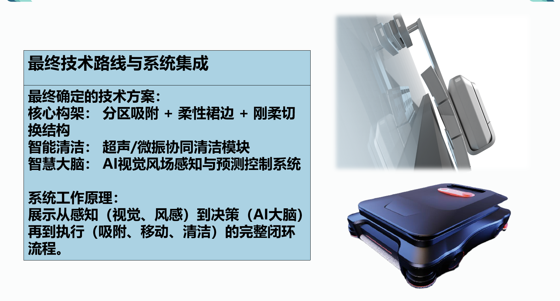该作品以“智能闭环+高效适配”为核心设计理念,凭多维度创新突围,其分区吸附+刚柔切换结构保障高贴合抗风,超声与微振模块可实现高效去污零划伤,AI视觉风场系统构建可实现降能耗与主动响应。同时,该作品融合流线机身导风增稳、风能回收提续航、数字孪生运维、模块化适配多场景等10项设计,辅以人机接口降低操作门槛,借助专业工具破解技术矛盾,最终实现稳定、智能、适配性的统一。