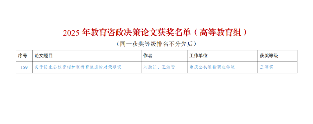 当前位置:首页 > 新闻中心 > 学校动态 > 学校动态 电子游戏获评2025年重庆市教育咨政决策论文三等奖1项 来源:学校动态发布时间:2026-01-28 07:48访问量: 重庆市教育委员会近日发出专门通报,公布2025年教育咨政决策论文征集评选结果,电子游戏榜上有名,获评高等教育组三等奖1项。 电子游戏获奖作品,为由党委宣传部刘胜江、王淑贤老师共同撰写、题为“关于防止公权变相加重教育焦虑的对策建议”的研究论文。 征集活动由市教委主办,旨在充分发挥教育咨政决策研究的重要作用,服务教育强市建设。 (文/库国静 )