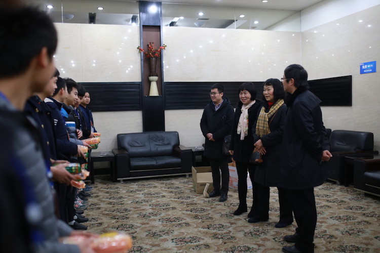 最后一站慰问点是重庆北北广场车间,北广场车间副主任余明娜、票房领班黄皓,热情接待了我院领导与老师们,并与36名实习志愿者们亲切交谈。首先,刘院长表达了学院对重庆北北广场车间领导的感谢,感谢他们为同学们提供的宝贵锻炼机会与平台,让他们真的可以“开眼看世界”;其次,彭书记、刘院长与实习志愿者们亲切交流了实习的心得与感受,刘院长讲到,我们的同学们应该以高标准的职业素质严格要求自己,学会学习、学会感恩,感恩车间领导与师傅们、感恩学院、感恩父母。刘院长深情的发言赢得了实习志愿者们的热烈掌声;最后,彭书记向北广场车间领导、所有实习志愿者们送上新春祝福,并亲自送上慰问品。