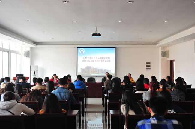 2015年3月18日,澳门正规电子游戏平台“2015年寒假铁路春运志愿者阶段工作总结会议”在A403会议室举行。出席会议的有赵月望院长、院团委彭文华书记、招生就业办陈香副主任、运输贸易系曾庆东书记、轨道车辆与机械系丁晓莹书记、负责春运调度的徐敏老师及临客K4123列车组近120名春运志愿者,会议由陈香老师主持。