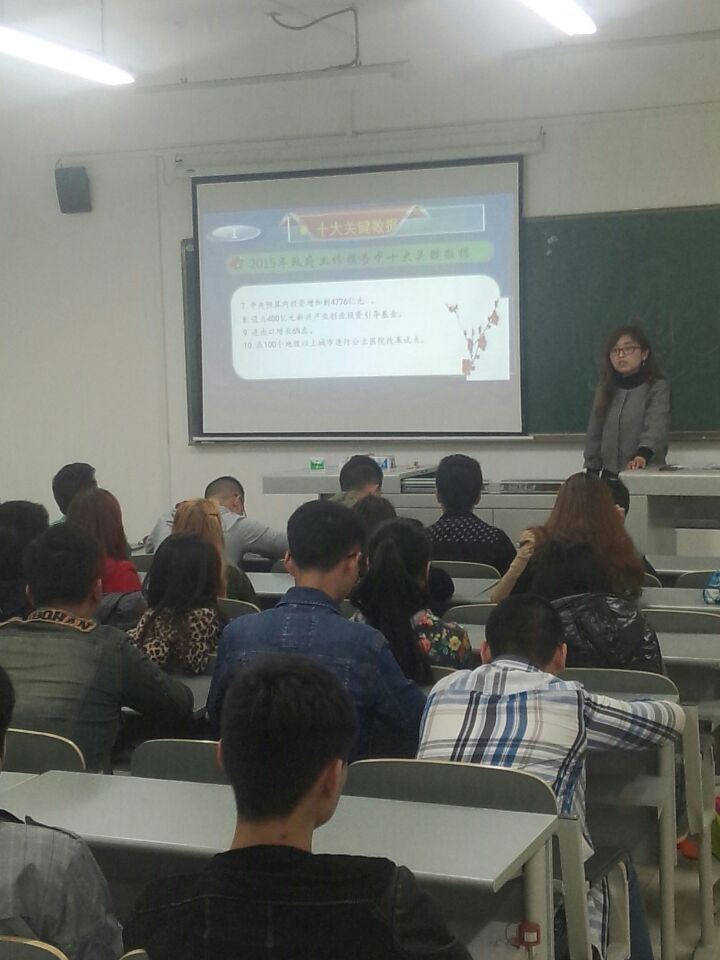 此次班会就李克强总理的政府工作报告的一些难点和重点方面也给同学们作了详细的分析和耐心的讲解。以这样的方式更能让同学们在学习生活中去关注社会的方方面面。在关注自身的同时,关注国家的发展动态,了解国情,关心时事,提高大学生的政治素养,有利于艺术专业学生的个性发展。