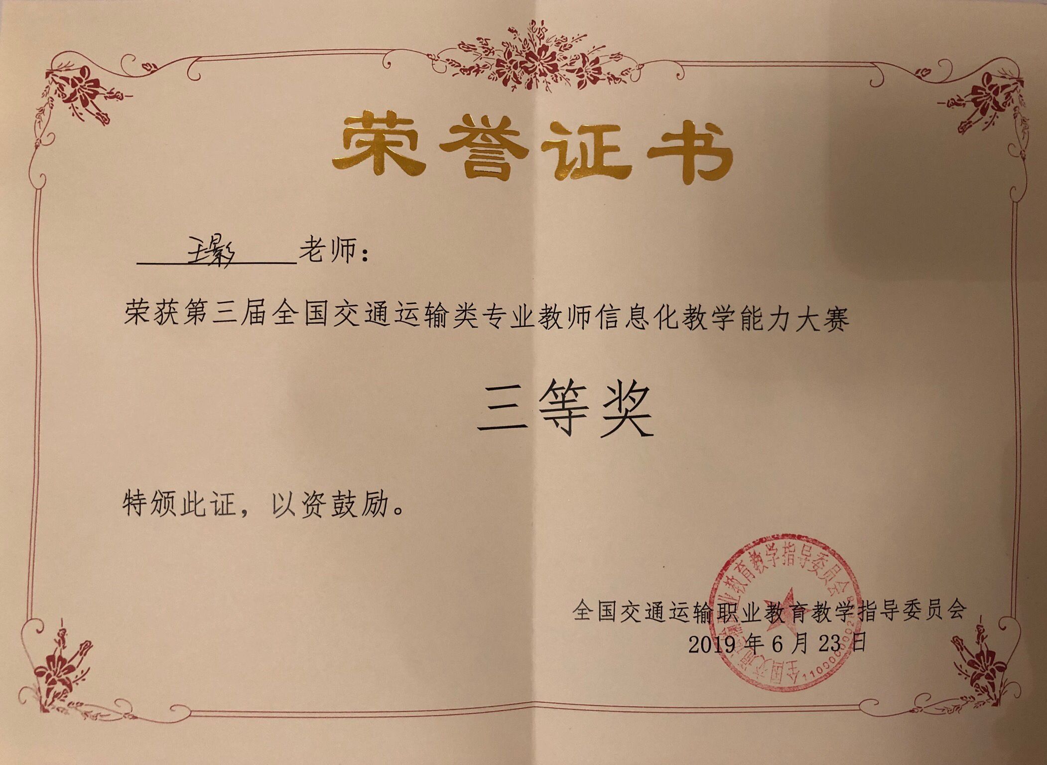 铁道与建筑学院 教学实训 科研建设 教学实训首页 > 铁道与建筑学院 > 教学科研 > 教学实训 > 在“第三届全国交通运输类专业教师信息化教学能力大赛”决赛中,铁建系王影老师获得三等奖 来源:教学实训发布时间:2019-06-25 15:05访问量: 6月23日,由全国交通运输职业教育教学指导委员会主办的“第三届全国交通运输类专业教师信息化教学能力大赛”决赛在山东交通职业学院举行。本次比赛共有1044位教师参加海选,754位教师进入初赛,通过选拔,最终150位教师进入了现场决赛。经过现场答辩、专家评审等比赛环节,我系教师王影获得了三等奖。