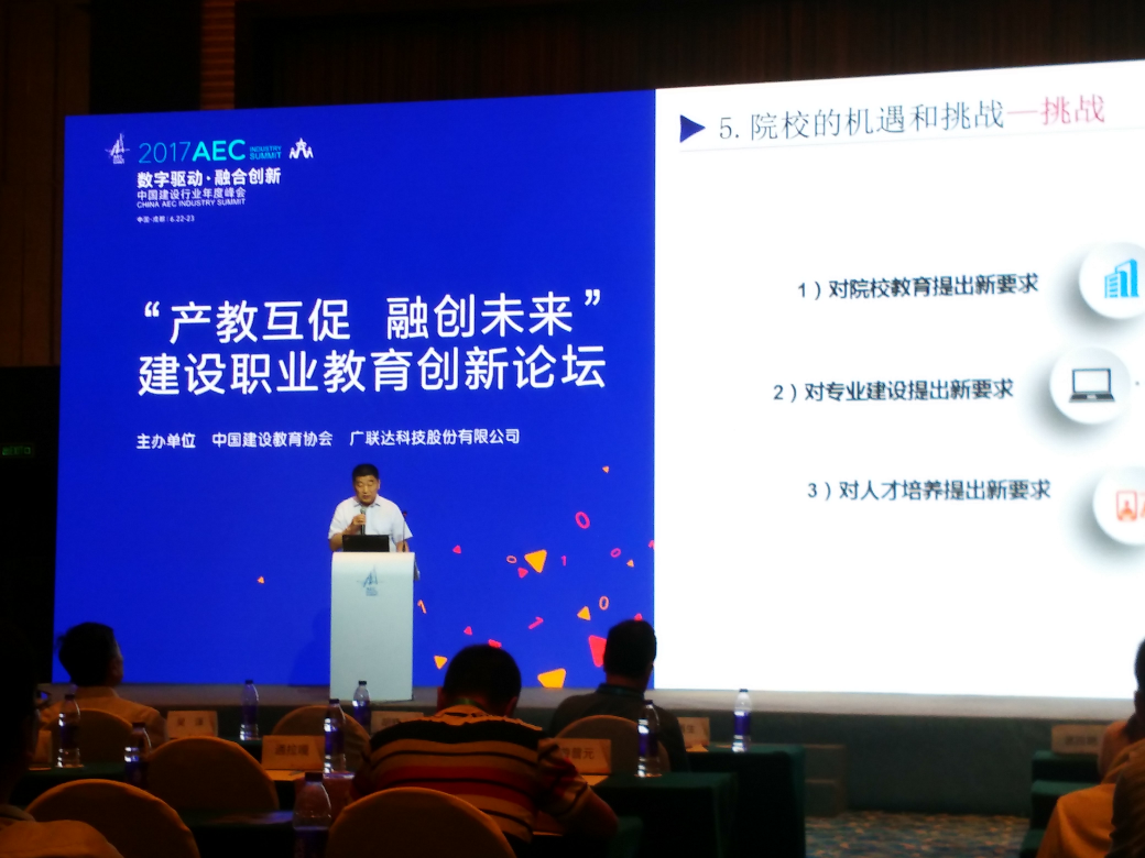 铁建系何安荣主任、甘元彦老师还参加了“产教互促融创未来”建设职业教育创新分论坛。分论坛就国务院办公厅关于促进建筑业持续健康发展的意见(国办发〔2017〕19号文)对于建筑类院校的影响与机遇,中国建设教育协会领导、到会的高等职业教育专家,就新时期高等职业教育土木建筑类专业改革与发展,装配式建筑与 BIM技术结合的人才培养方案,校企合作人才培养新思路、新模式,BIM+VR、AR技术在建筑工程教学中的探索,建筑业转型升级建筑各专业教学应对策略,新时期建筑类企业人才需求变化等几个热点问题进行了探讨和互动对话。
