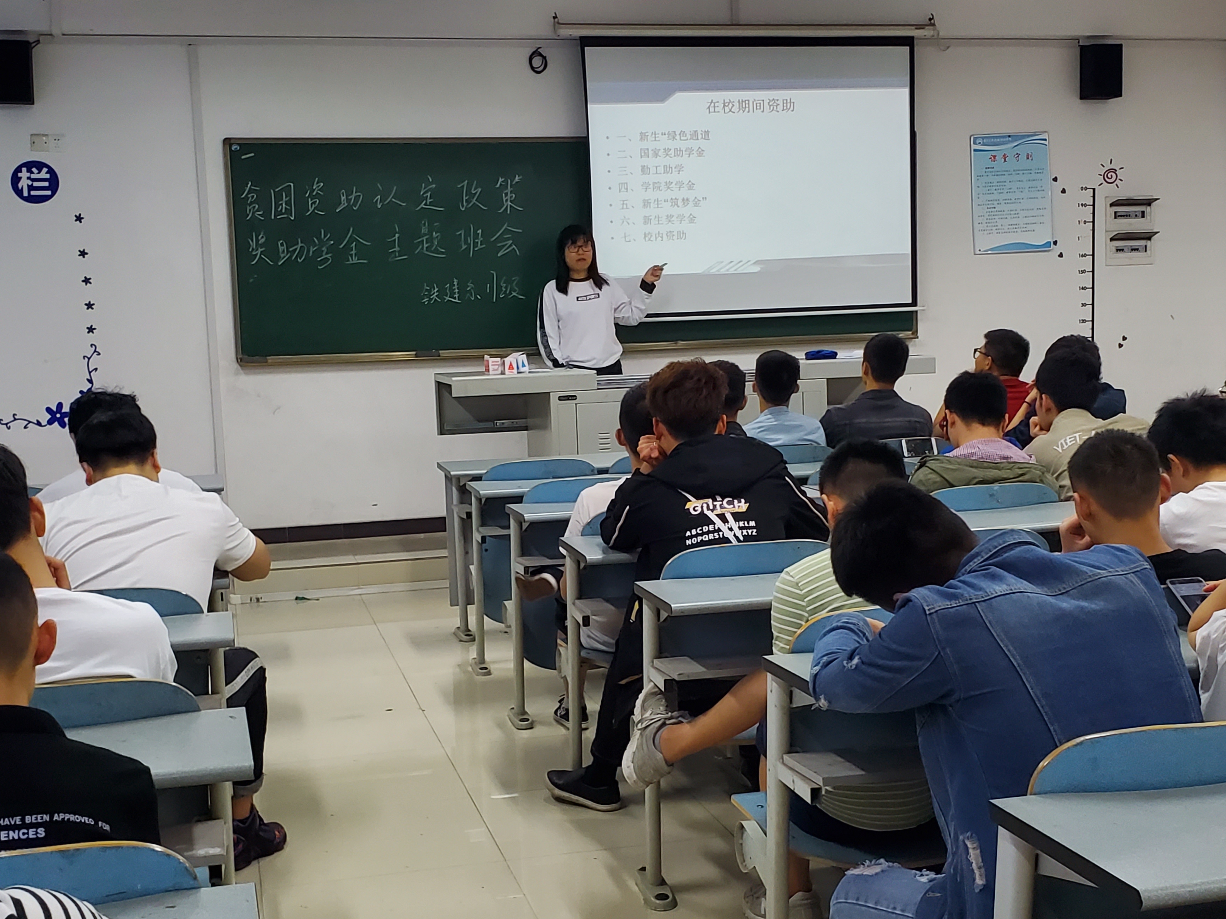 2019年5月13日袁佐霄辅导员在C308教室组织全体17级铁建系学生展开以贫困资助认定政策、奖助学金的主题班会,旨在让同学们对国家资助再次有进一步的了解。开展资助是为了减轻真正贫困学生的上学问题,辅导员袁佐霄主要讲解了: