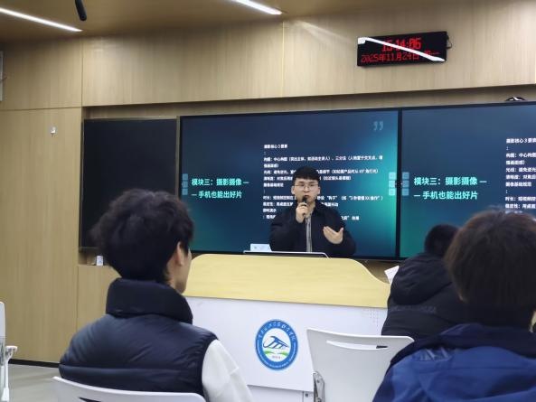 培训中,郭希诚老师结合现有校园媒体实践经验与校园宣传案例,系统讲解了微信公众号数据监测、图文排版规范、新闻图片拍摄及宣传文案撰写等核心技能。围绕校园活动宣传优化提出专业建议,为同学们夯实宣传基础、提升实操能力。