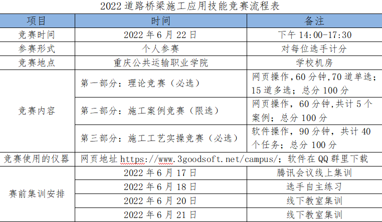 铁道与建筑学院 学院简介 专业设置 学院领导 学院动态首页 > 铁道与建筑学院 > 学院概况 > 学院动态 > 学院开展全国交通道桥施工技术应用技能大赛 来源:学院动态发布时间:2022-06-30 15:58访问量: 为培养学生“工匠”精神,提高学生动手能力,提升学生专业技能,调动学生学习专业技能的积极性,展示我院道路与桥梁工程技术专业实践教学成果,检验学生对生产实践问题的分析与处理能力,促进学生对施工员相关岗位的了解。我院道路与桥梁工程技术专业于2022年6月22日在主校区D306开展了2022年全国交通道桥施工技术应用技能大赛。 本次比赛的赛前培训和比赛事宜安排如下表所示: