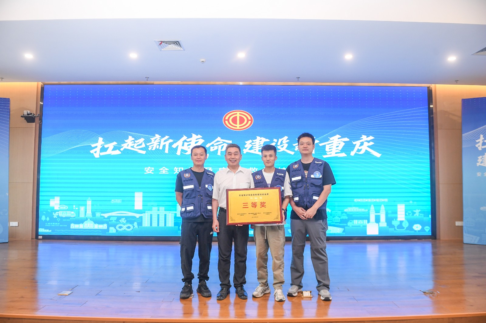 6月10日,由重庆水务环境集团主办的安全知识及应急救援技能竞赛在重庆环卫集团洛碛国家资源循环利用基地举行。通过知识竞答、消防战斗服穿戴、20米干粉灭火器灭火、两盘水连接、简单包扎等项目的比拼,电子游戏周宗明劳模工作室选派的铁建三名教师获三等奖。