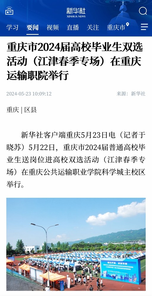 当前位置:首页 > 新闻中心 > 媒体聚焦 > 媒体聚焦 【新华社】重庆市2024届高校毕业生双选活动(江津春季专场)在重庆运输职院举行 来源:媒体聚焦发布时间:2024-05-23 11:11访问量: