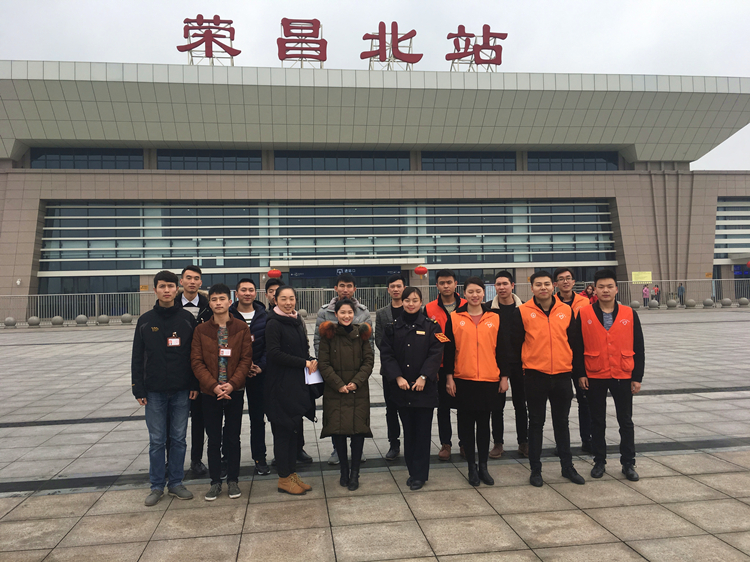 2017年1月12日,在学院的统筹安排下,成铁定制班冉彤老师和运输贸易系梁晓芳老师带领10名同学赴大足南站和荣昌北站参与春运志愿者活动,大足南站副站长张代钢、荣昌北站副站长丁勇进行了接待。
