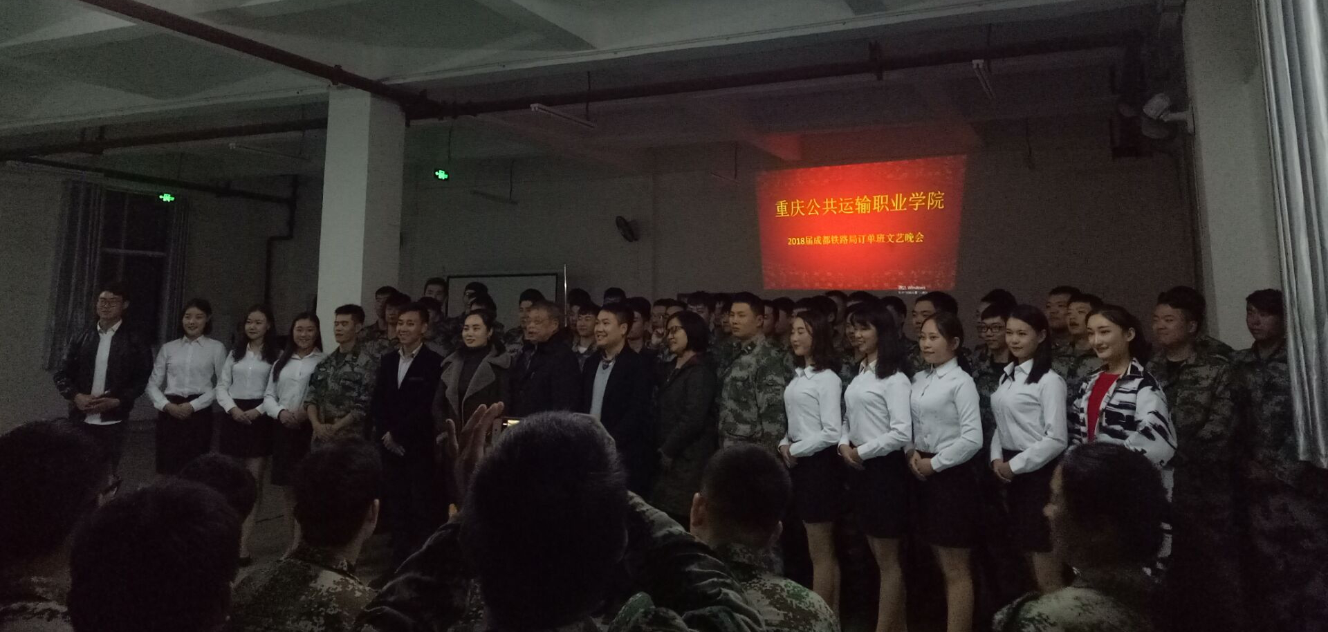 2017年11月27日晚,我院2018届成都铁路局订单班文艺晚会在江津区双福街道九江大道大岭湖百战教育基地举办。参加此次晚会的有黎光全老师,杨莉老师,余杭老师,石盼老师和194名成铁订单班的学生以及培训这批订单班学生的教官们。