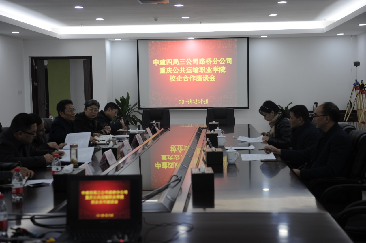 2017年2月27日,中建四局第三建筑工程有限公司路桥分公司纪委书记税清林、副总经理李光金、综合办人事经理黄洁一行莅临我院,与我院就校企合作开办订单班等事宜进行深度的、实质性的座谈交流。学院董事长李灿、院长赵月望、常务副院长李海峰、副院长刘畅,及发展规划与对外合作处、招生就业处、铁道与建筑工程系、轨道车辆与机械系、轨道电气系等部门人员和学生代表参加了会议。座谈会由学院副院长刘畅主持。