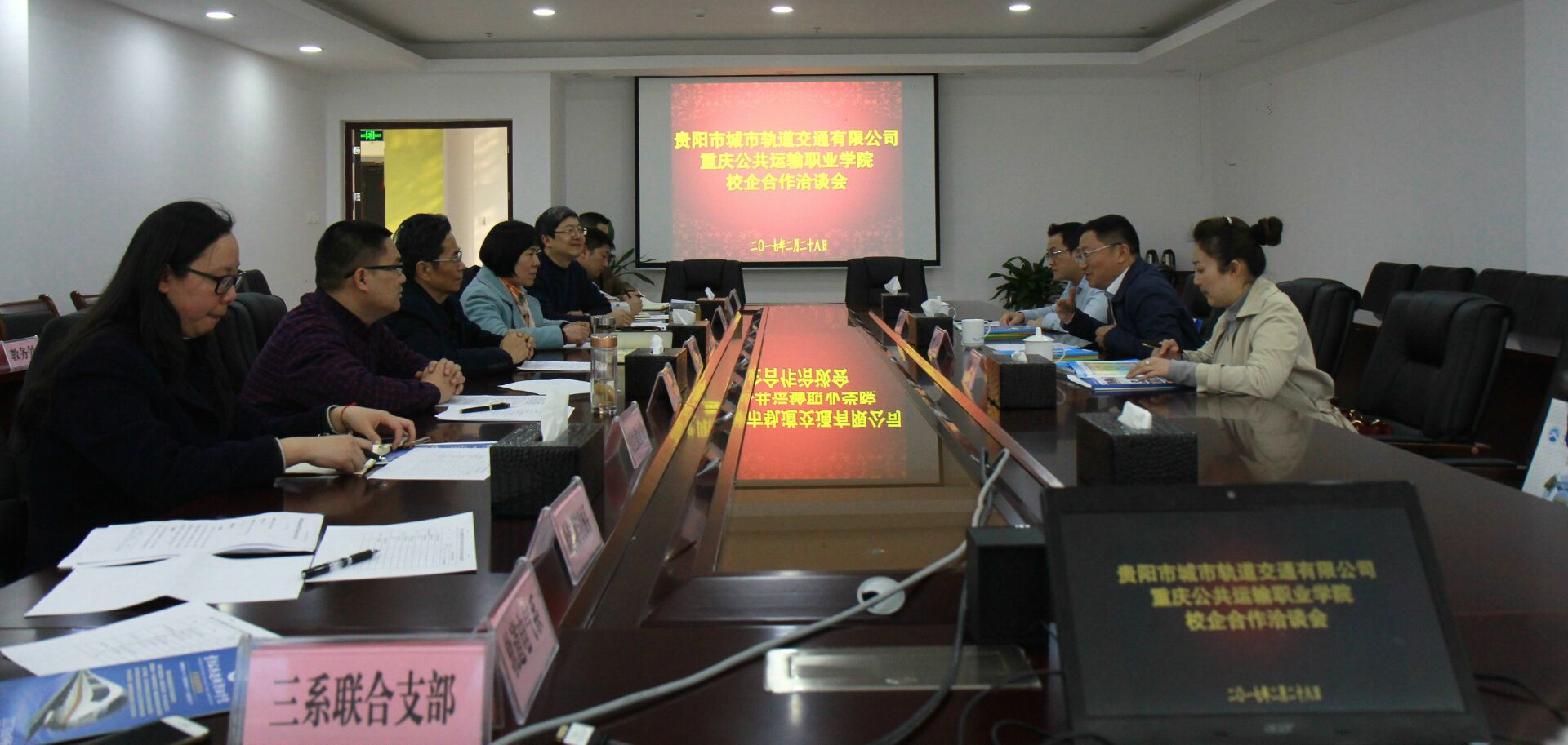 2017年2月28日,贵阳市城市轨道交通有限公司副总经理兼运营分公司总经理李焱、运营分公司副总经理段俊、运营分公司综合部副经理陈浩等到学院参观考察并进行了校企合作洽谈。学院院长赵月望、党委书记彭超、常务副院长李海峰、副院长刘畅,及发展规划与对外合作处、招生就业处、教务处、学生处、轨道电气系、轨道车辆与机械系、运输贸易系、三系联合党支部负责人等出席了活动。