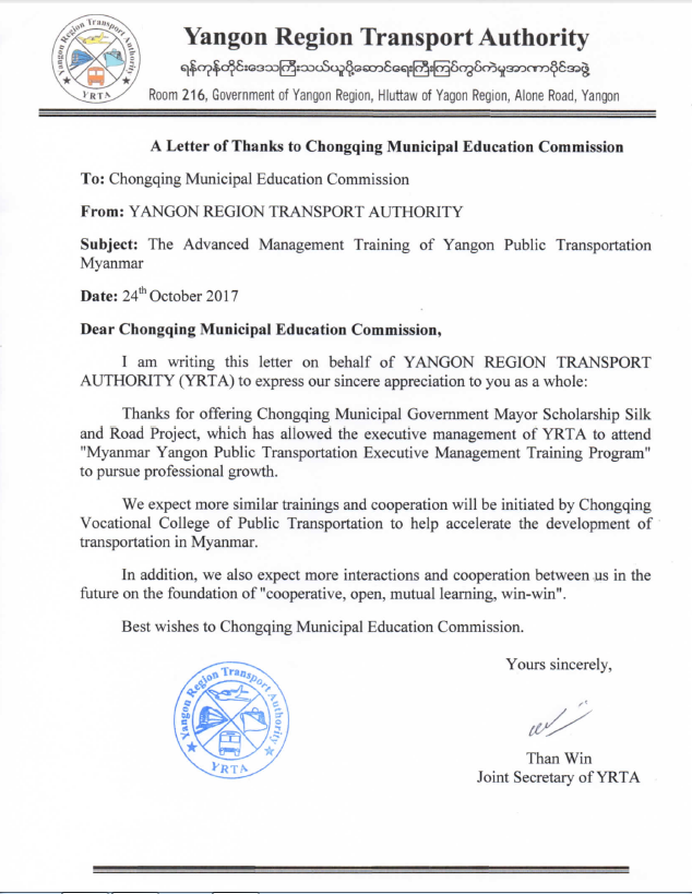 尊敬的重庆市教育委员会:我代表缅甸仰光省交通委员会向贵单位为“缅甸仰光省公共交通高级管理研修班”给予的大力支持表达诚挚的谢意。