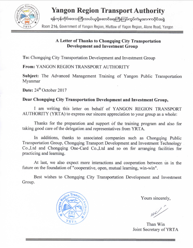 译文:缅甸仰光省交通委员会给重庆城市交通开发投资(集团)有限公司的感谢信