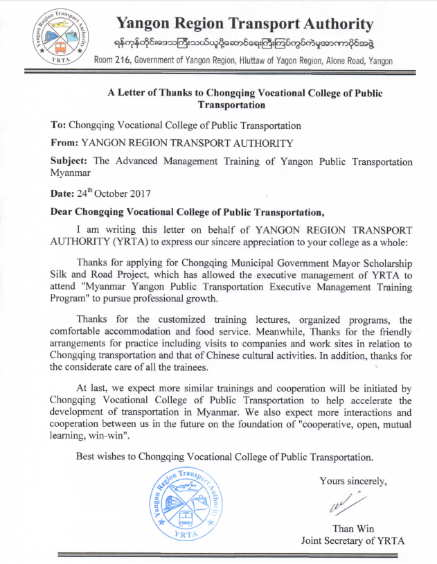 为贯彻落实教育部《关于印发<推进共建“一带一路”教育行动>的通知》和交通运输部、教育部《关于加快发展现代交通运输职业教育的若干意见》文件精神,同时为服务重庆交通开投集团公共交通一体化系统及跨座式单轨等优质产能“走出去”的需求,结合缅甸联邦共和国仰光省交通厅希望澳门正规电子游戏平台提供公共交通高级管理人才培训的实际需要,2017年9月,澳门正规电子游戏平台举办的“缅甸仰光省公共交通高级管理研修班”项目圆满实施。 项目实施效果达到了合作双方既定目标,近日,缅甸仰光省交通委员会特向本项目的举办方——重庆市教委、重庆交通开投集团和我院发来感谢信,感谢各方的大力支持,赞扬“丝路精神”的发扬促进了缅甸交通事业的发展与提高。