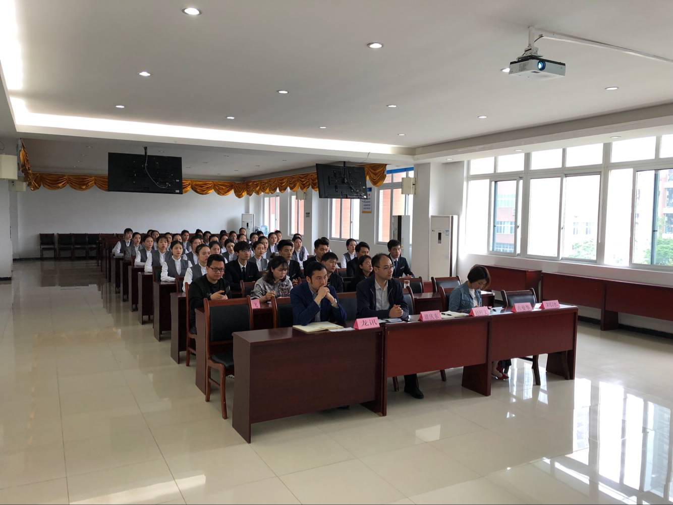 为响应学院教育事业“十三五”发展规划,进一步促进学生教育管理工作内涵建设与学生职业素质教育深度融合,确保职业素质教育结合专业特点、加强针对性、注重实效性,充分发挥班集体的载体作用,运输贸易系于2019年4月16日9:00在教学楼A413举行高铁乘务班验收成果会议,参加本次会议的有运输贸易系主任赵柱文、党支部副书记曾庆东、学工办主任古曼筝、学生处刘金飞老师、运输贸易系各辅导员老师以及高铁乘务班全体同学。