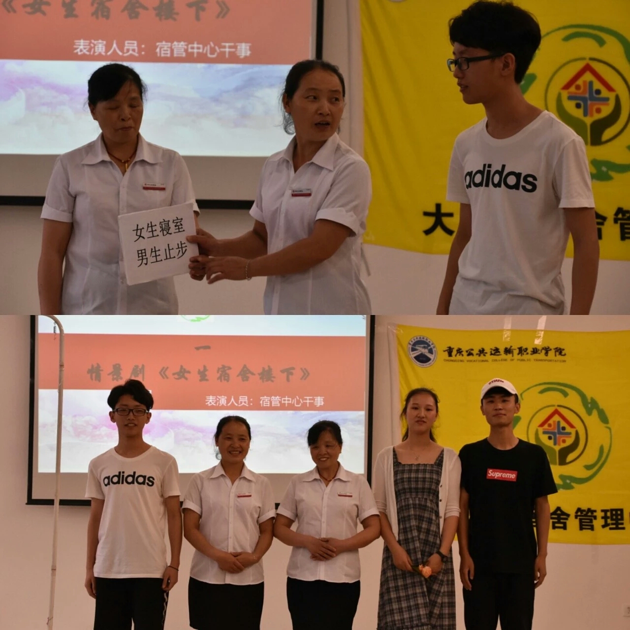大会开始大家共同视频回顾了活动时的精彩内容。其次是小品表演和心理剧的表演,宿管阿姨和宿管中心干事为大家带来的小品《女生宿舍楼下》和心理成长协会评选出的优秀心理剧表演《都是攀比惹的祸》。不仅是让我们沉浸在大家的精彩表演中,更是告诉我们要追求精神深层次的实在美,勿让自己因一时的思想偏差而让自己的人生轨道脱轨,让自己的精神变得虚荣灵魂变得空洞的道理。随后我们进行了颁奖,宿管阿姨获得“敬业勤奋”奖。获得“绿色寝室”代表颁奖,获得“优秀寝室心理之家”小报寝室代表颁奖。待王敏阿姨、获奖代表、宿管干事发表感言后,宿管中心干事们为我们带来了舞蹈串烧,舞出了青春无限活力。活动的最后,宿管中心指导老师刘金飞,为本次活动进行了总结,为这次的活动拉下帷幕.