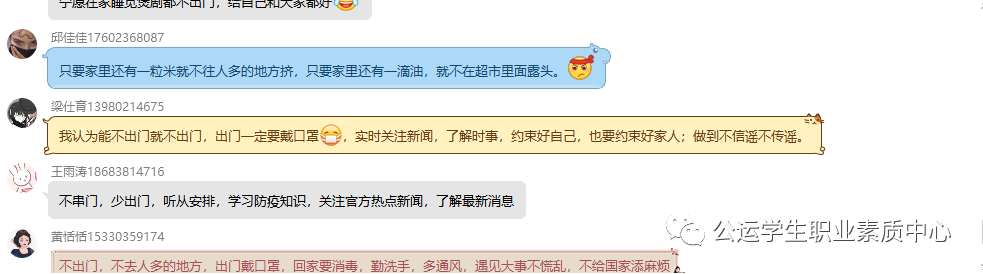 利用本班守护同学们健康的赵玲同学、三世同堂共抗疫的王雪蕾同学、党旗所指团旗所向的漆云霜同学的疫情防控故事,引导同学们踏踏实实做好本职工作,敢于奉献敢于担当,彰显青年学子的责任与担当。