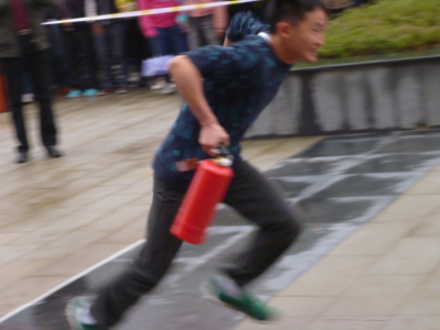 第二环节是灭火器实操接力赛。老师一声令下,参赛队员们就拿着灭火器争分夺秒地开始比赛,队员们行动敏捷、配合默契,在有限时间内很好地完成了比赛任务,得到在场同学和老师的阵阵欢呼声。