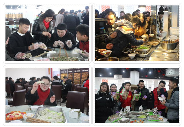 食堂里更是年味十足,红灯笼、新春对联、福字纷纷上墙,一大早工作人员就来到食堂开始布置,准备饺子皮、饺子馅儿、水果、花生、瓜子等,为留校同学们举办“包饺子・贺新春”联欢活动,给同学们营造家的感觉。同时,也让泰国留学生们进一步体验中国传统文化,感受浓浓的中国情,体味浓郁的中国味。彭书记细心的教同学们包饺子,话家常,现场欢聚一堂,相互问候,恭贺新春。