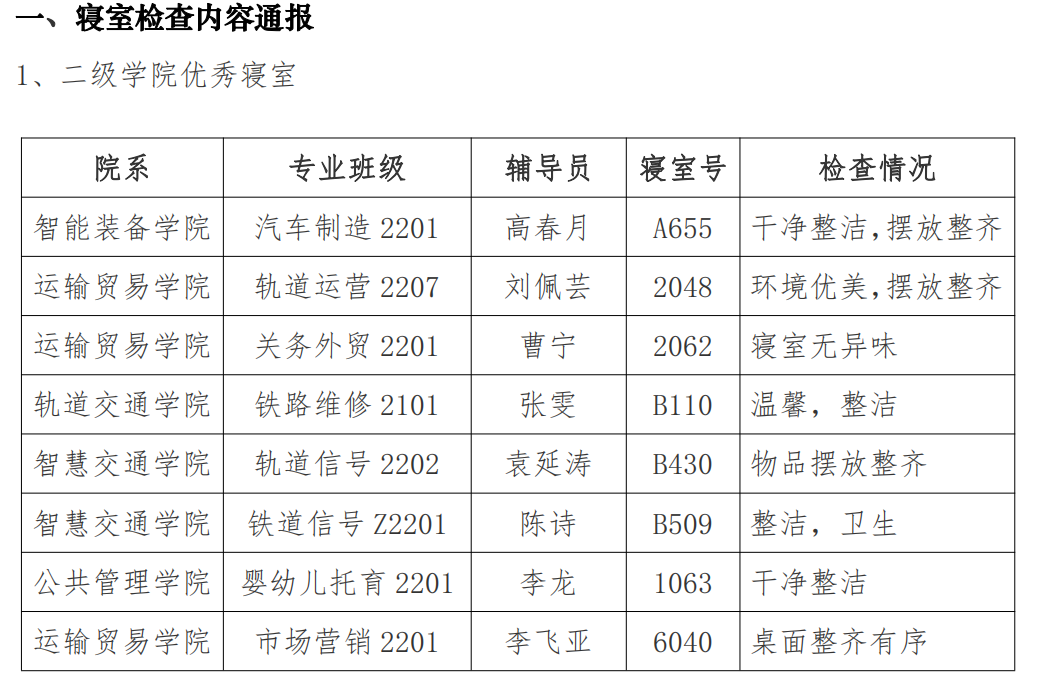 为促进大学生健康成长,营造整洁、卫生、安全、有序的宿舍环境,推动校园精神文明建设。轨道交通学院团总支于 3 月 27 日对学院所属寝室卫生进行了内务检查评分。检查过程中,检查小组对各宿舍环境仔细卫生观察,认真地打分。针对文明寝室创建活动中优秀寝室进行通报奖励表扬,对不合格寝室现场逐一指出并提出解决措施,要求按期进行卫生整改。