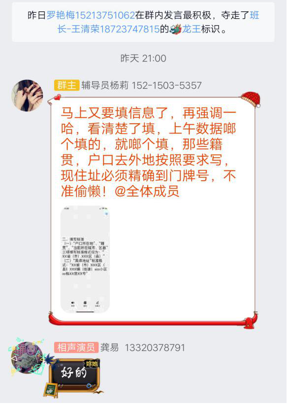 其中来自运输贸易系的杨莉老师所带班级分别是:交通运营1801、1802,城市轨道交通运营管理1803、1804、1805,共计217名学生。杨老师不管是生活中还是学习中,她始终像个大姐姐一样的存在,时刻陪伴在大家的身边。疫情来临期前,她每天逐一详细了解同学们的行程,询问同学们的情况,更是将实习学生们详细情况落实到位。在疫情来袭后,依旧不停歇将学生的安全情况落实到位。她通过网络沟通及时传达学校指令并落实到位,严格履行防控职责,确保学生平安。每天将疫情防护知识向同学们普及,并安排相关学生干部将学院要求学生填写的新型冠状病毒信息采集打卡任务按时的完成。若有没有填写的学生,她更是通过电话、短信、QQ、微信方式进行联系,严格监督其工作进度,坚决杜绝误报、漏报和瞒报情况发生。并引导学生们有效利用假期好读书、勤学习、多运动、做家务等,实现“停课不停学”。