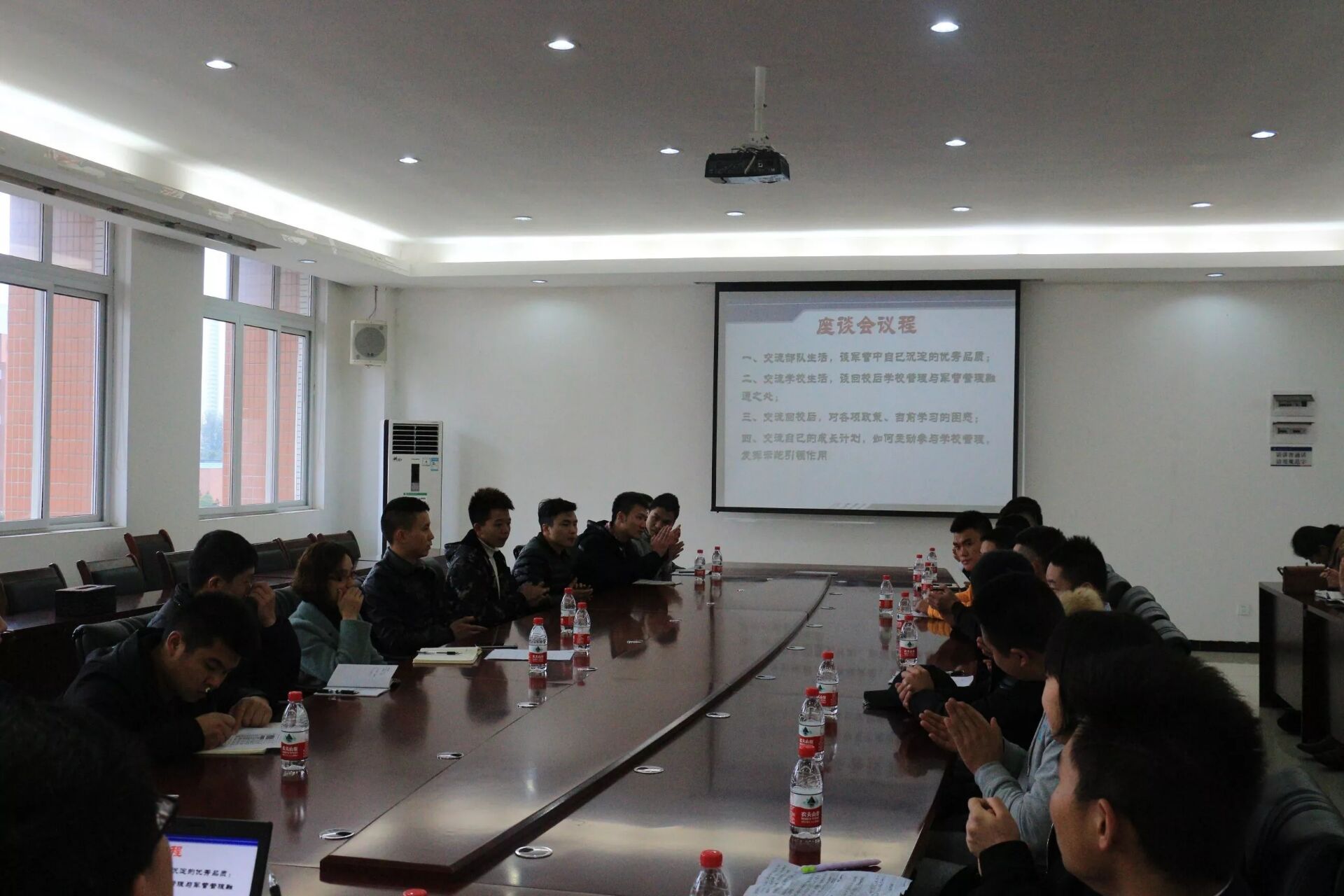退役学生交流部队生活、在军营中所沉淀的优秀品质;交流学校生活,谈回校后学校管理与军营管理的融通之处;交流回校后对各项政策、当前学习的困惑;交流自己的成长计划,如何主动参与学校管理,发挥示范引领作用等。